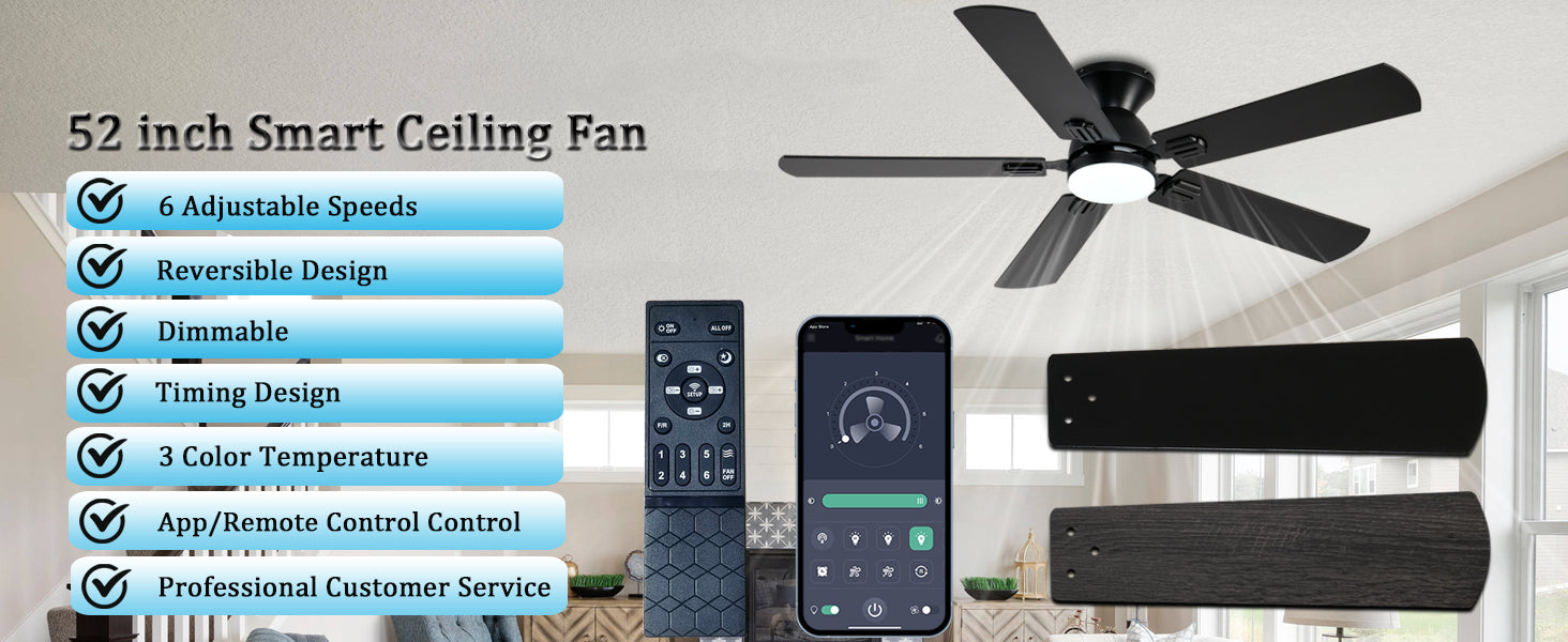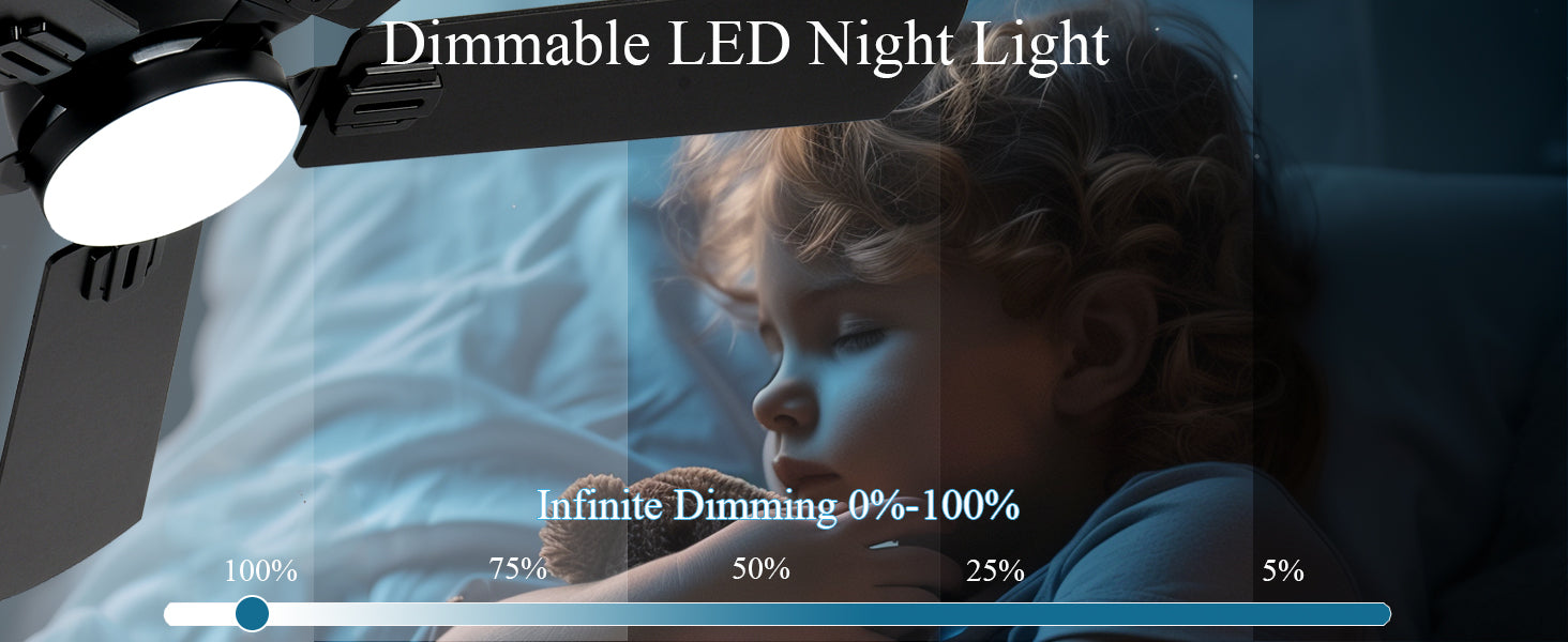 Yes, all our ceiling fans feature dimmable LED lights with adjustable brightness. You can choose from warm white (2700K), neutral (4000K), or cool white (6000K) lighting to match your room's ambiance. Brightness and color temperature can be controlled via the included remote or wall control.