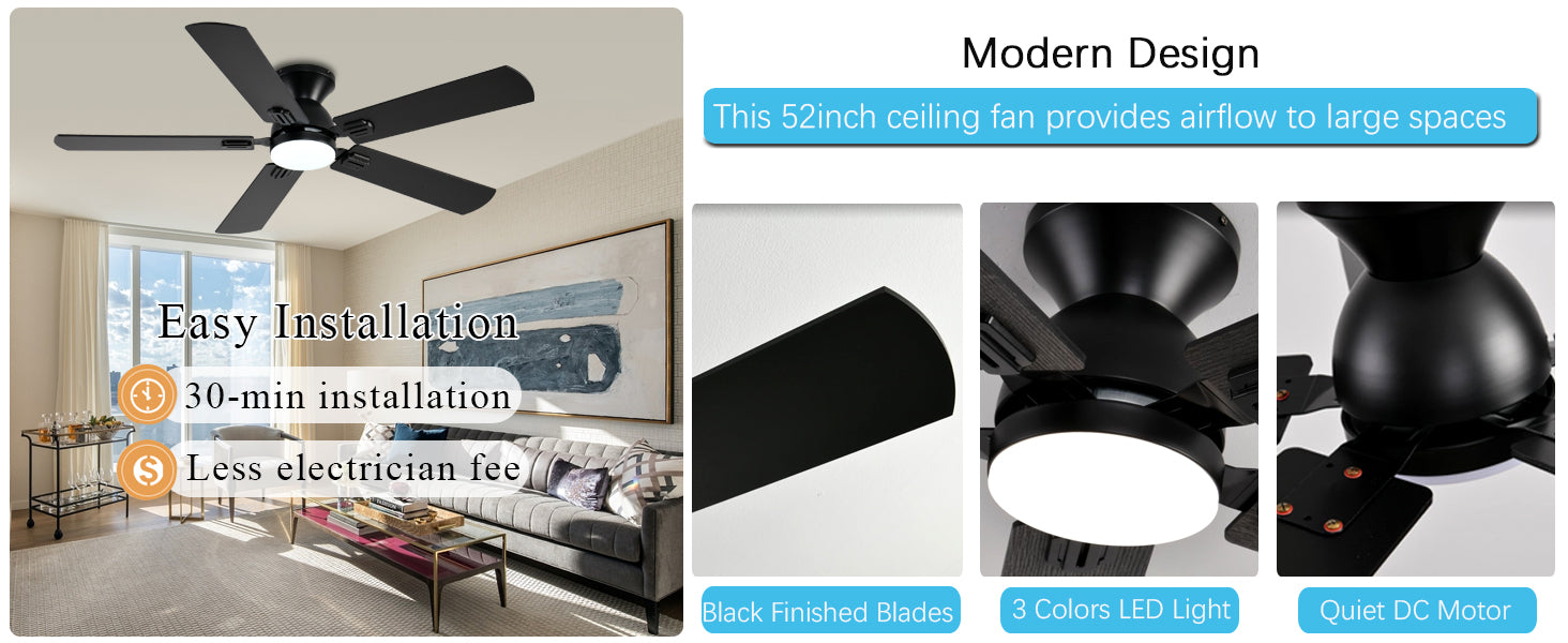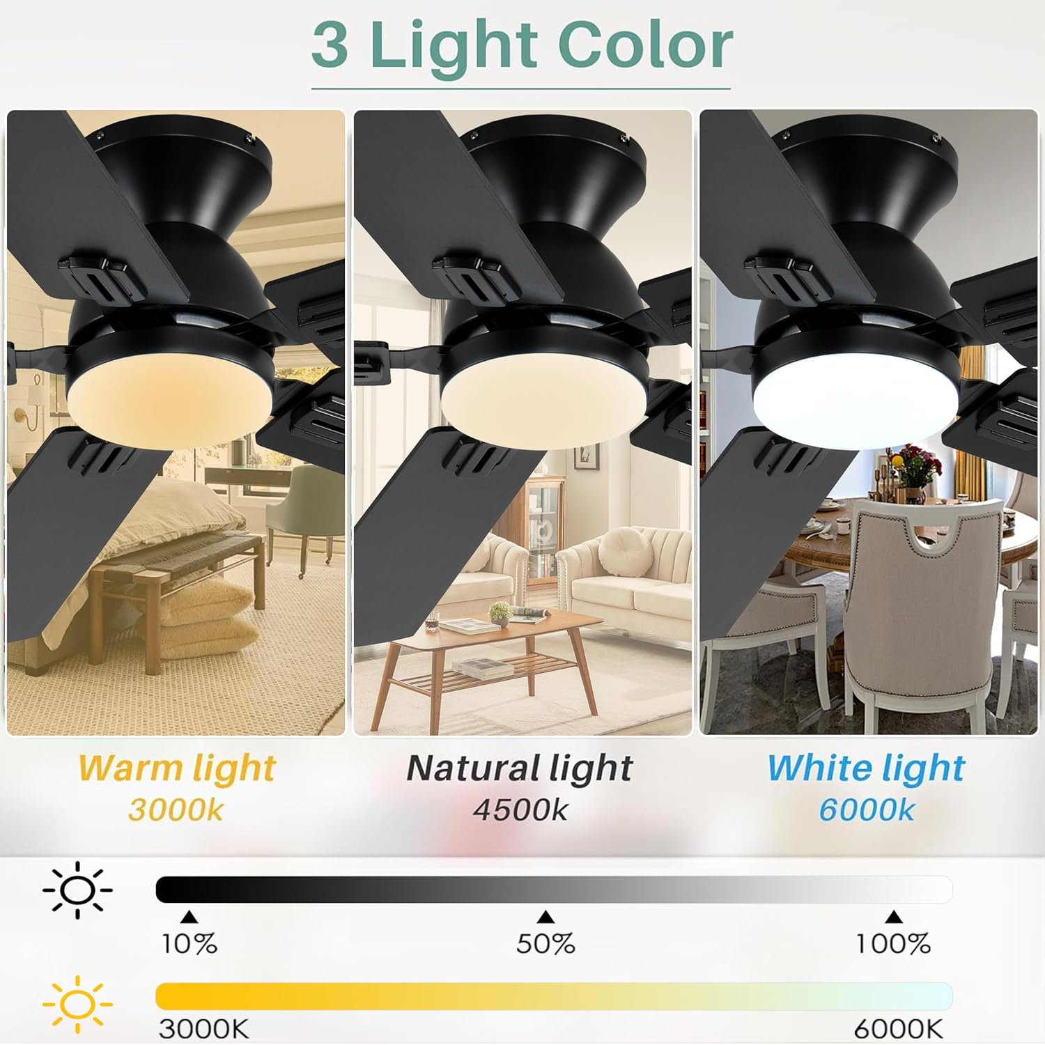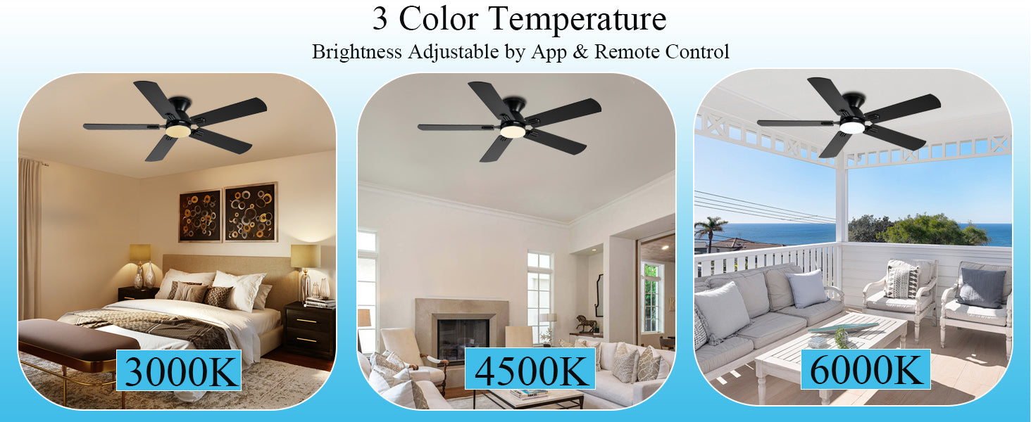 • 【Dimmable LED Light Ceiling Fan】: Our 52-inch ceiling fan features adjustable lighting design with a 18W LED light panel. It offers brightness adjustment from 10% to 100% and comes with 3 light colors (3000K warm light, 4500K natural light, 6500K cool light) to meet various indoor settings such as study rooms, bedrooms, and night time lighting needs.