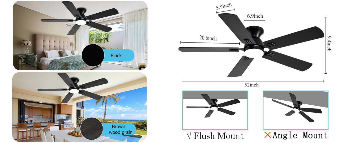 52 inch Ceiling Fans with Lights,Low Profile Ceiling Fan with Remote Control and App, Double-sided Fan Blades, 3CCT Dimmable LED, Noiseless, Flush Mount Ceiling Fan for Bedroom, Patio