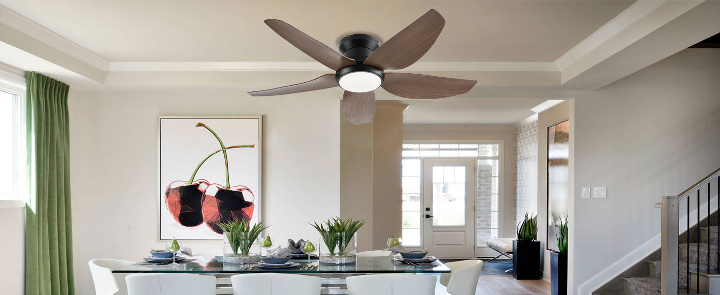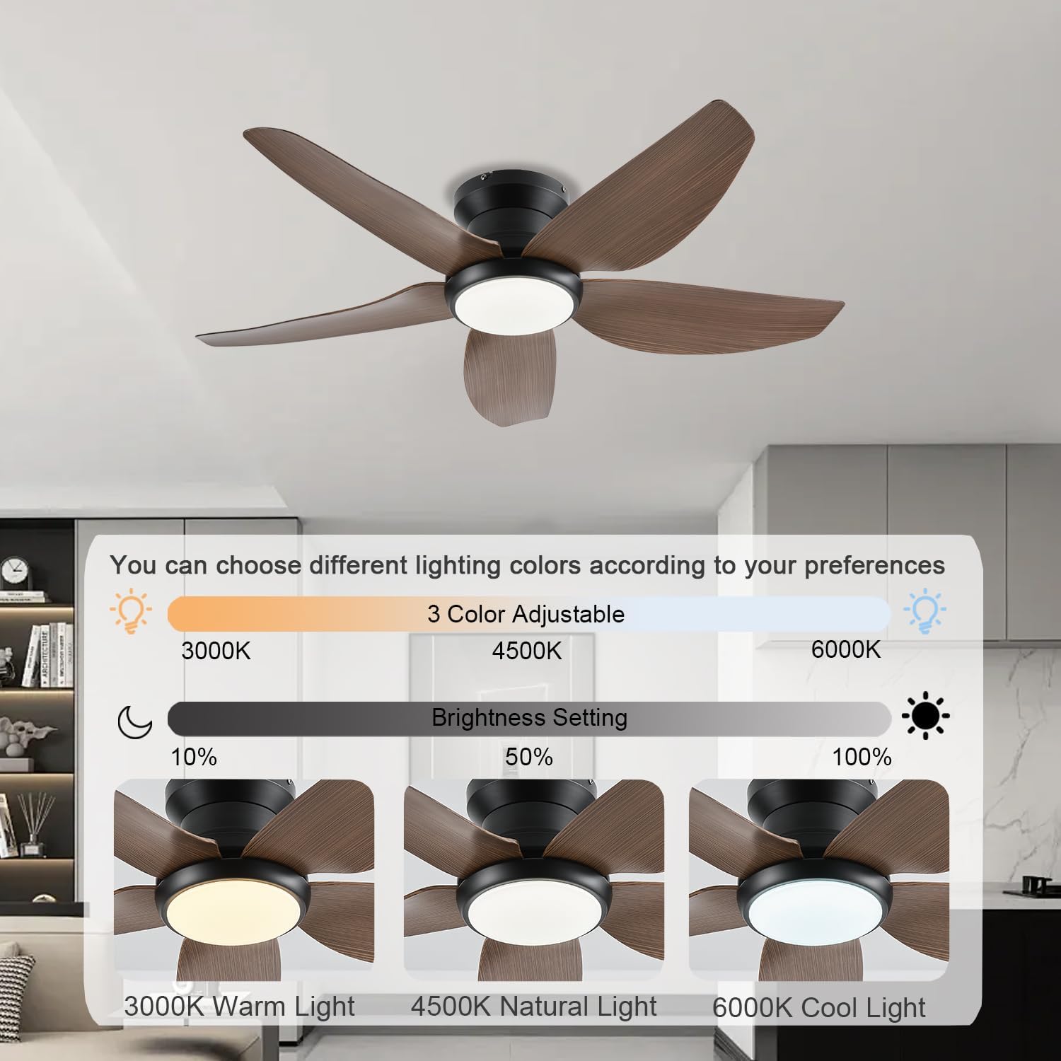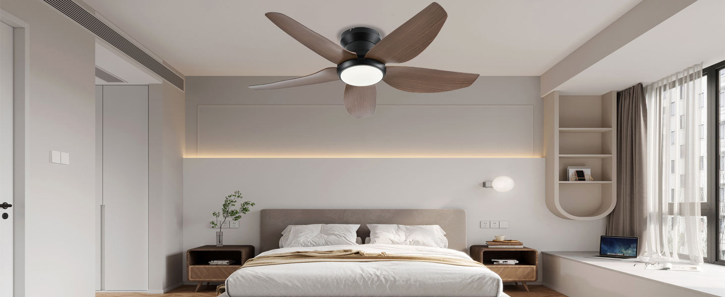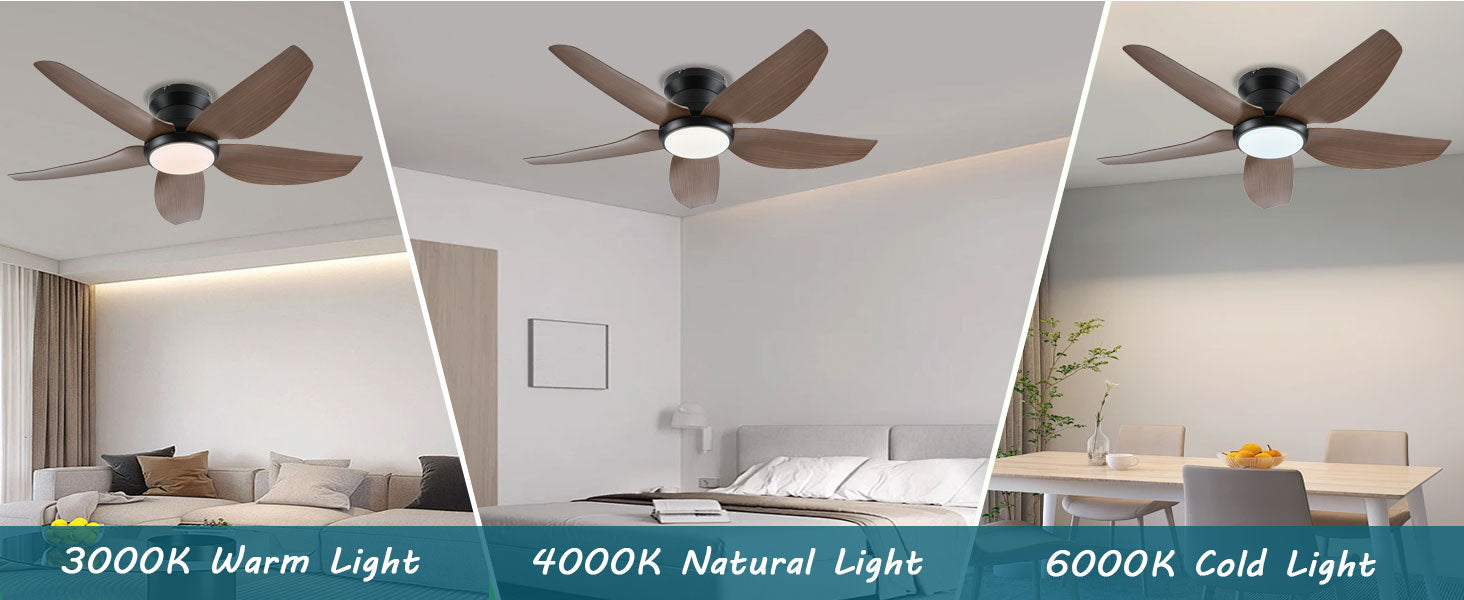 Yes, all our ceiling fans feature dimmable LED lights with adjustable brightness. You can choose from warm white (2700K), neutral (4000K), or cool white (6000K) lighting to match your room's ambiance. Brightness and color temperature can be controlled via the included remote or wall control.