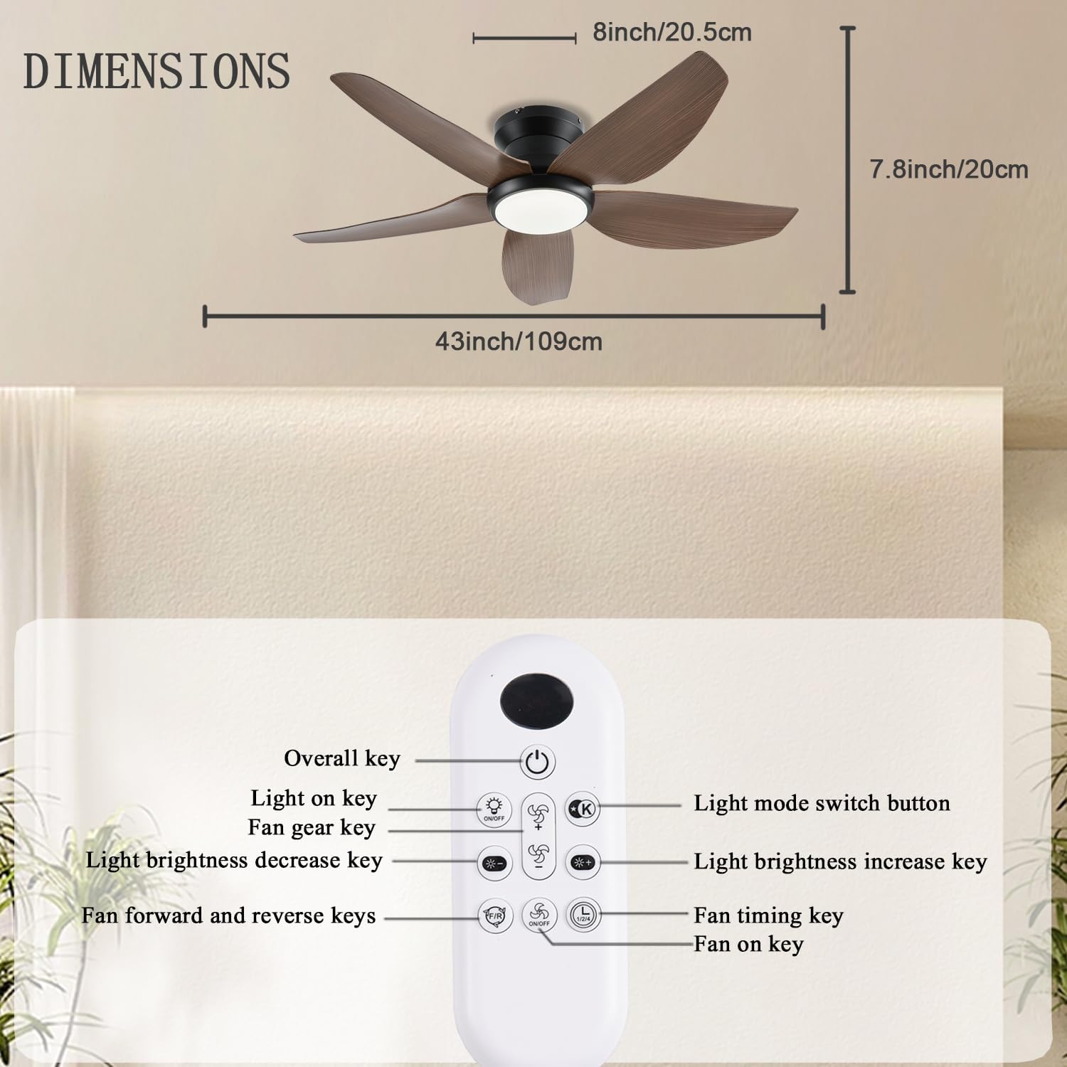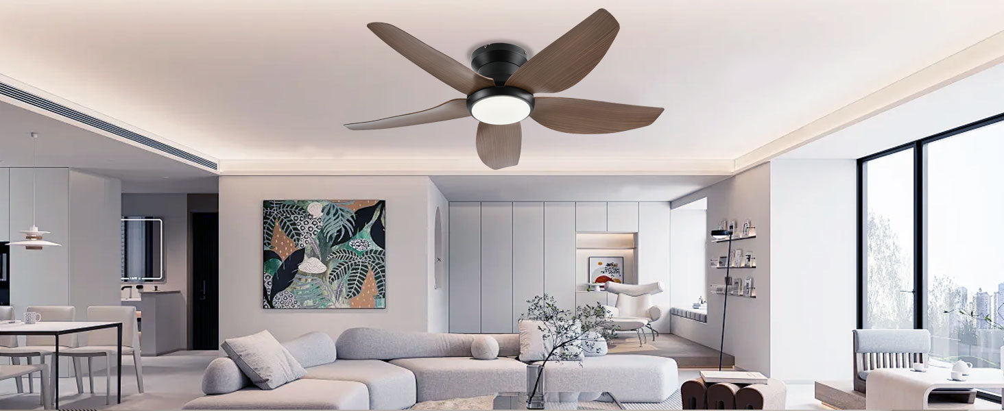 Ceiling Fans with Lights, 43 Inch Low Profile Ceiling Fan with Light and Remote/App Control, Flush Mount, Reversible DC Motor, 3CCT, Dimmable, Noiseless, Brown Ceiling Fan for Indoor/Outdoor Use