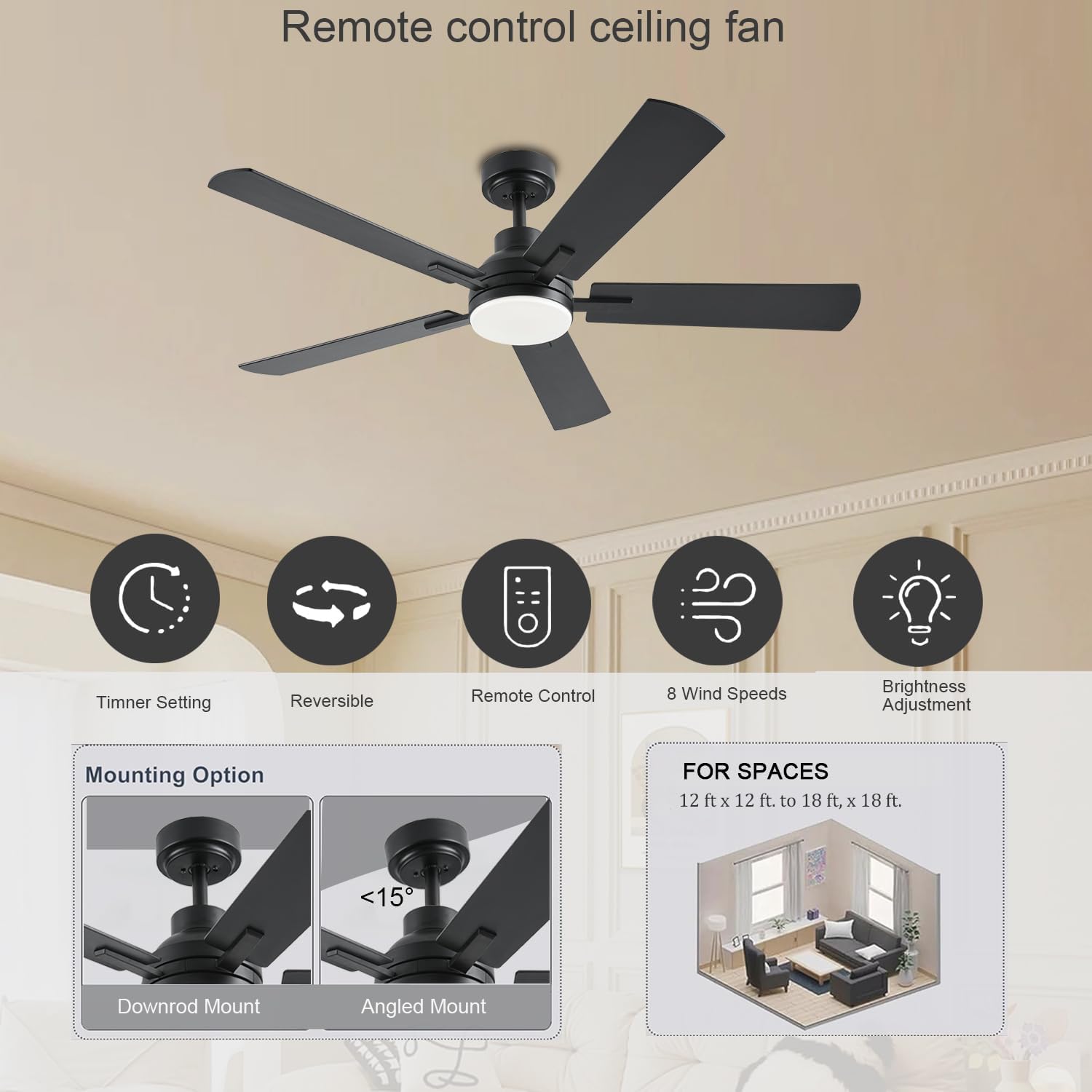 • 【Ceiling Fans with Lights and Remote】: This black ceiling fan with lights can be controlled using a remote and app, allowing for operation in forward/reverse directions, 8-speed adjustment, and 3 light colors. Easily adjust light brightness and color to suit different environmental needs, set 1/2/4H timers, and control the fan and light separately for maximum convenience and ease of use.