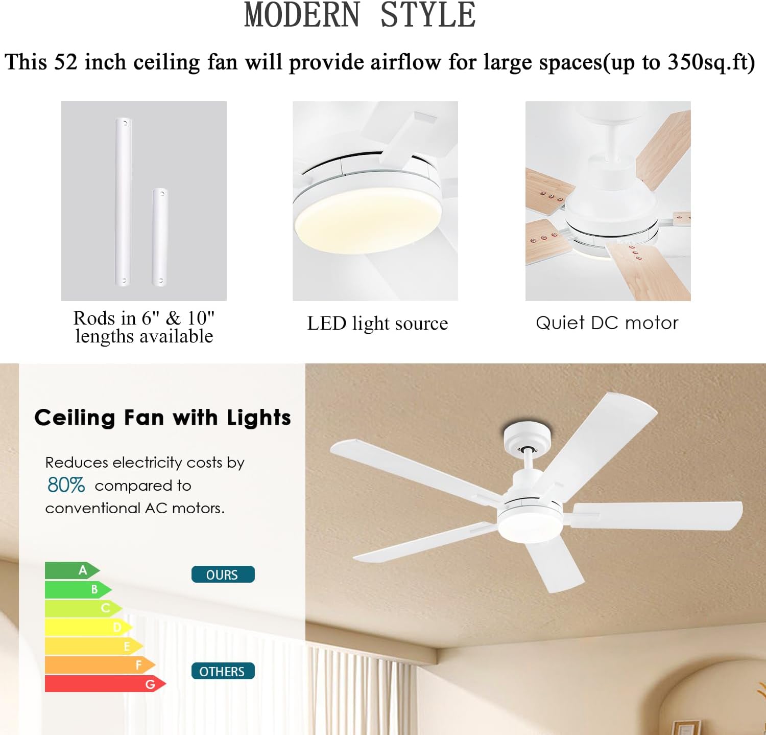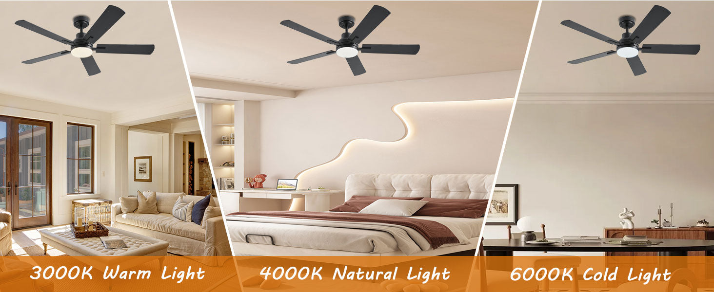 • 【Dimmable LED Light Ceiling Fan】: Our 52-inch ceiling fan features adjustable lighting design with a 18W LED light panel. It offers brightness adjustment from 10% to 100% and comes with 3 light colors (3000K warm light, 4500K natural light, 6500K cool light) to meet various indoor settings such as study rooms, bedrooms, and night time lighting needs.