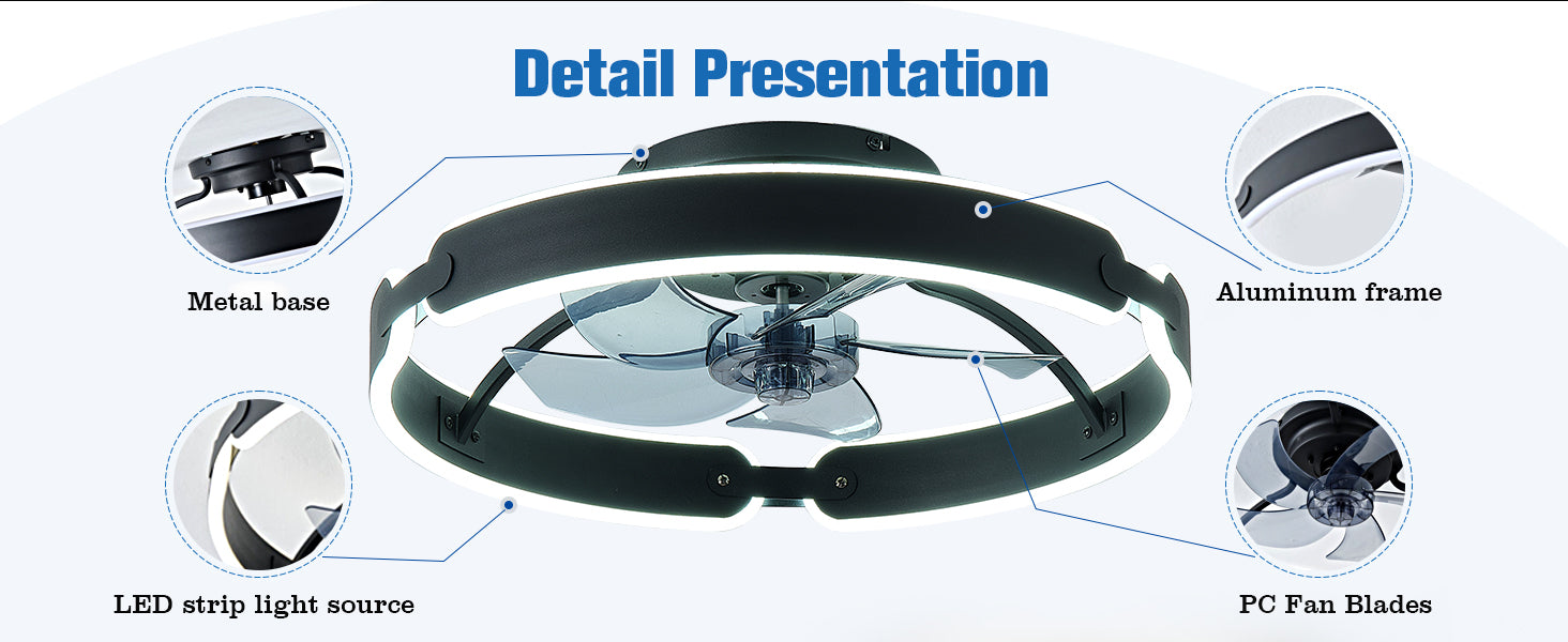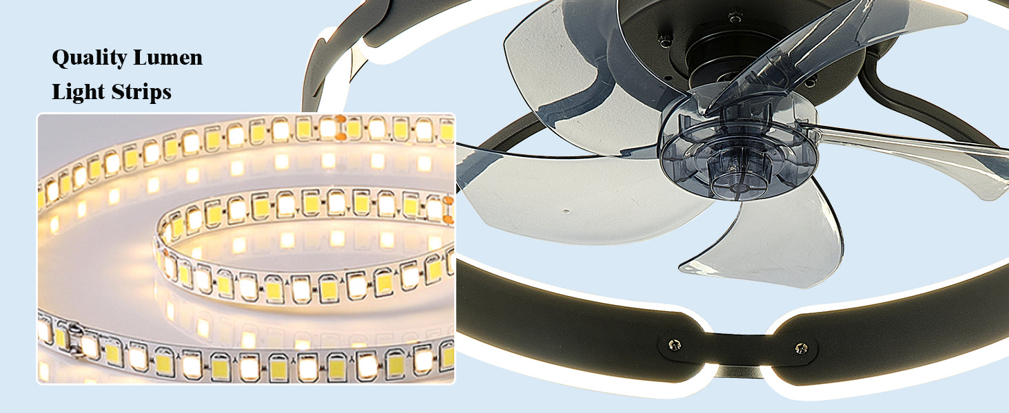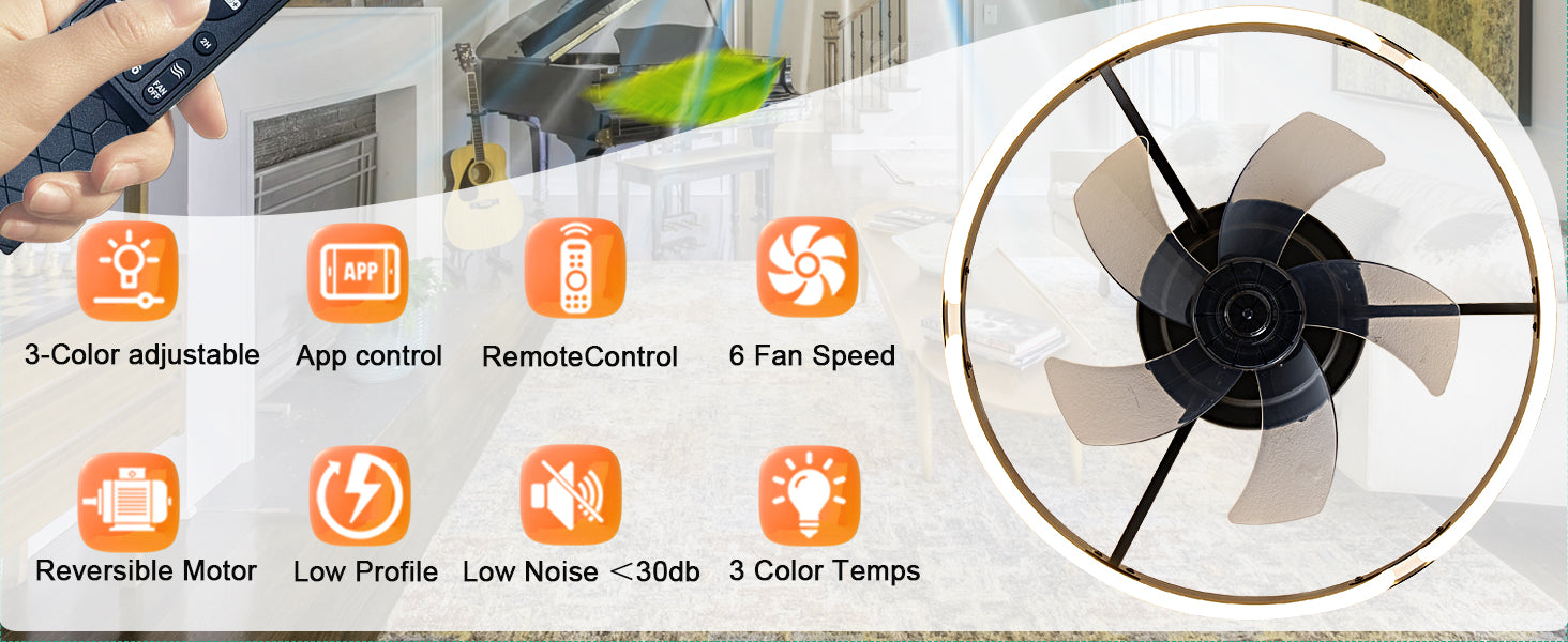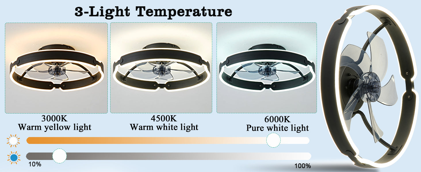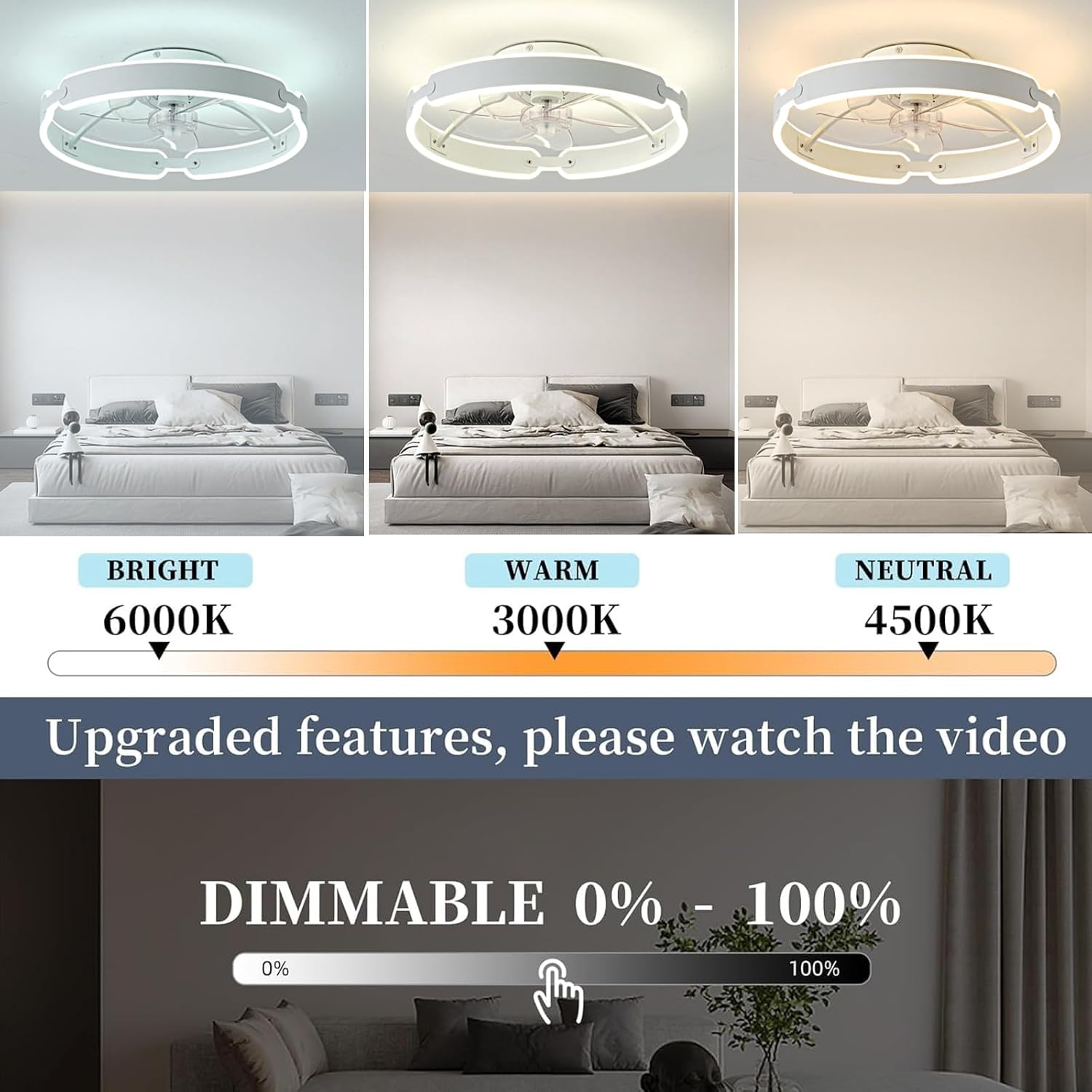 Yes, all our ceiling fans feature dimmable LED lights with adjustable brightness. You can choose from warm white (2700K), neutral (4000K), or cool white (6000K) lighting to match your room's ambiance. Brightness and color temperature can be controlled via the included remote or wall control.