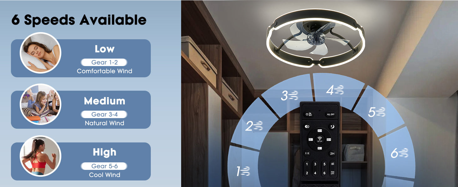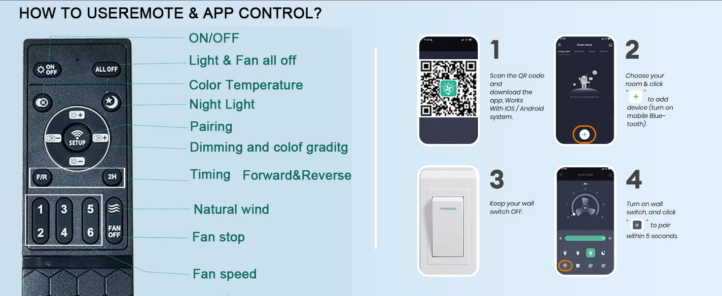 • 【Ceiling Fans with Lights and Remote】: This black ceiling fan with lights can be controlled using a remote and app, allowing for operation in forward/reverse directions, 8-speed adjustment, and 3 light colors. Easily adjust light brightness and color to suit different environmental needs, set 1/2/4H timers, and control the fan and light separately for maximum convenience and ease of use.