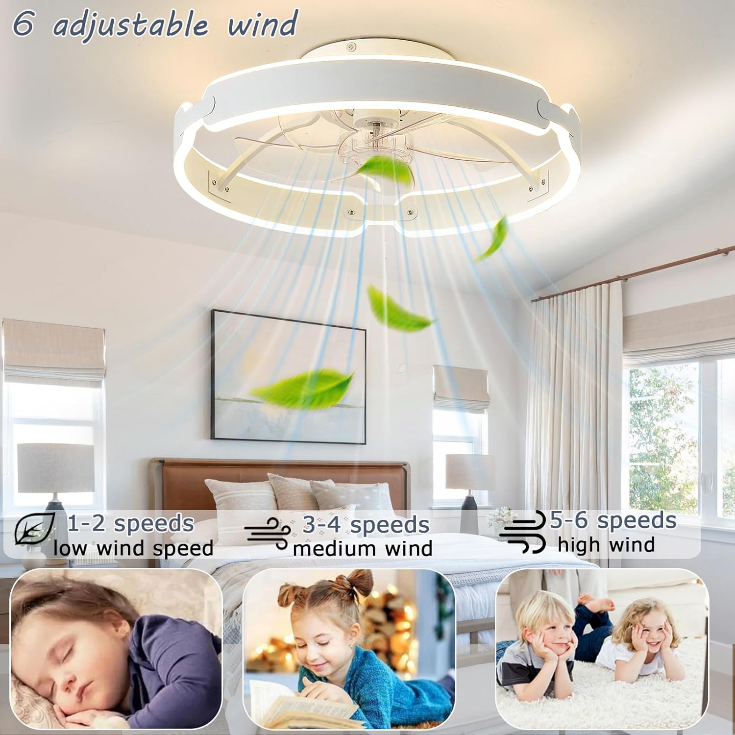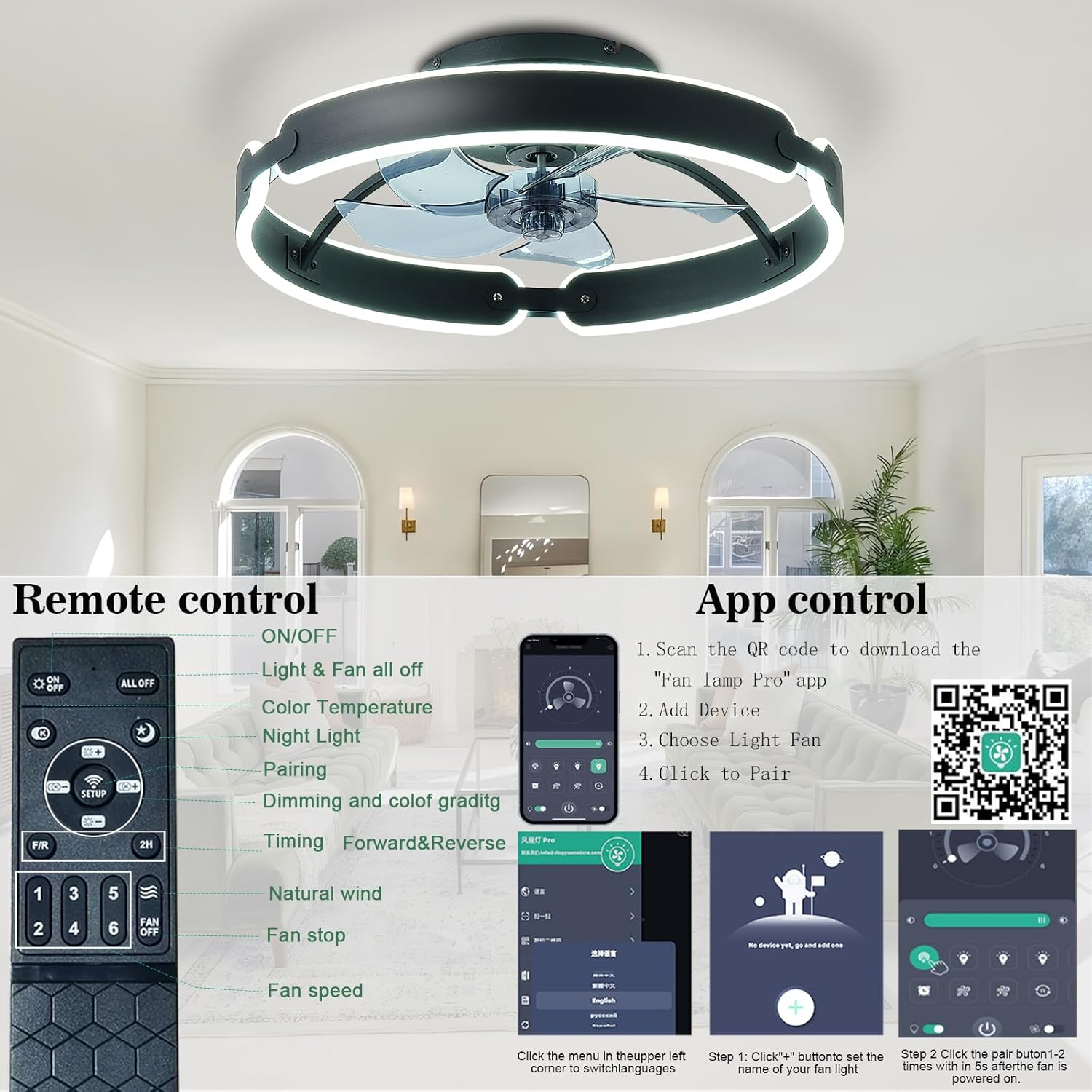 Ceiling Fans with Lights and Remote, 20'' Low Profile Ceiling Fan, 3000-6000K Dimmable Modern Flush Mount LED Fan Light, 6 Wind Speeds Black Ceiling Fans for Bedroom