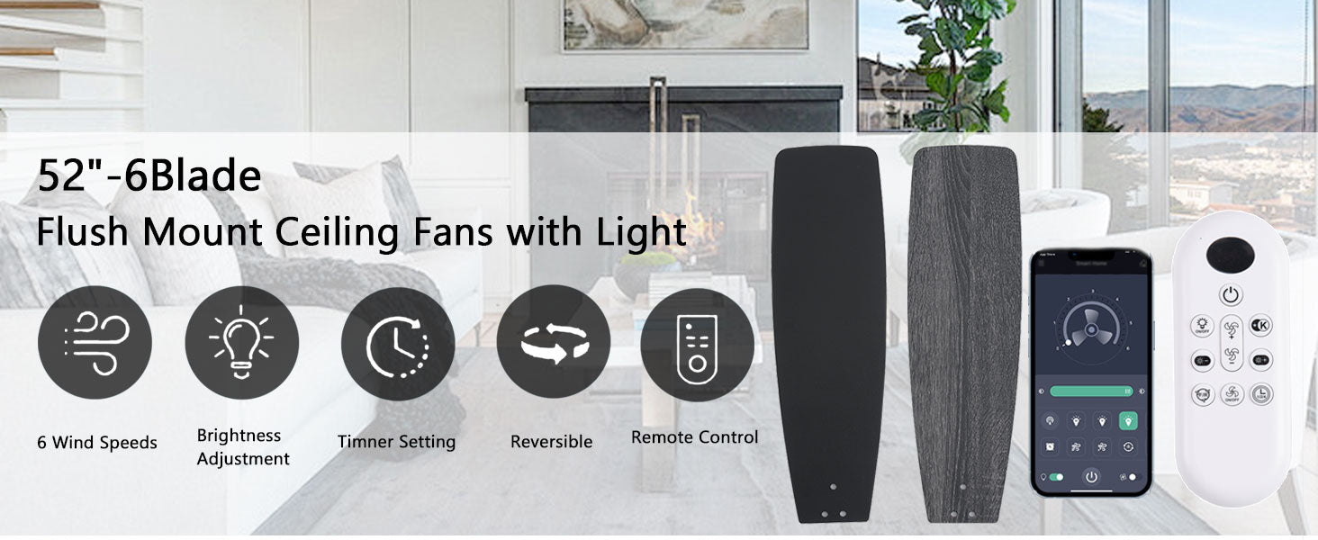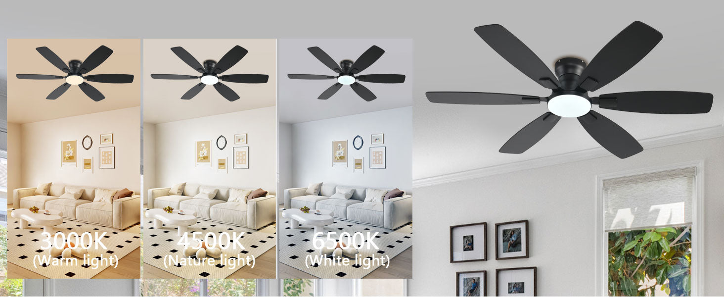 Yes, all our ceiling fans feature dimmable LED lights with adjustable brightness. You can choose from warm white (2700K), neutral (4000K), or cool white (6000K) lighting to match your room's ambiance. Brightness and color temperature can be controlled via the included remote or wall control.