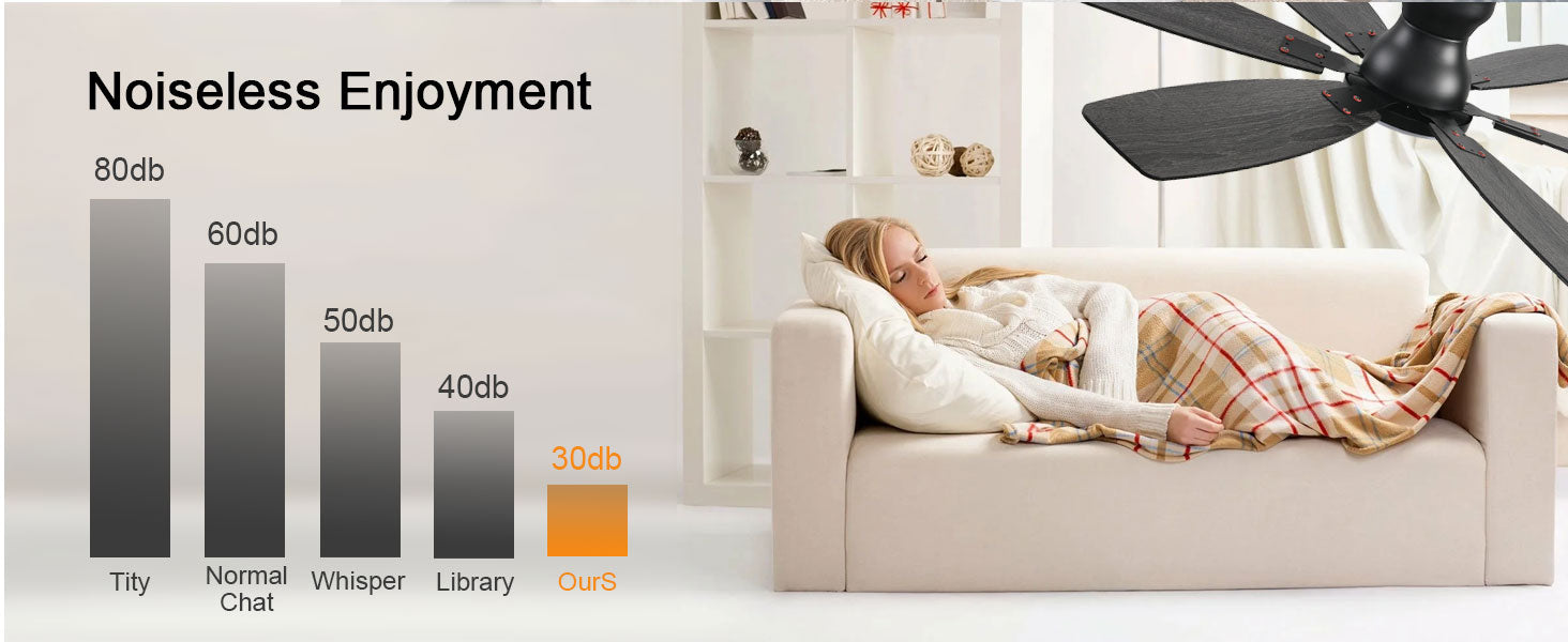 Our fans operate exceptionally quietly thanks to advanced DC motor technology. At the highest setting, they produce less than 35 dB - quieter than a whisper. On lower settings, they're virtually silent, making them ideal for bedrooms, nurseries, and quiet living spaces.