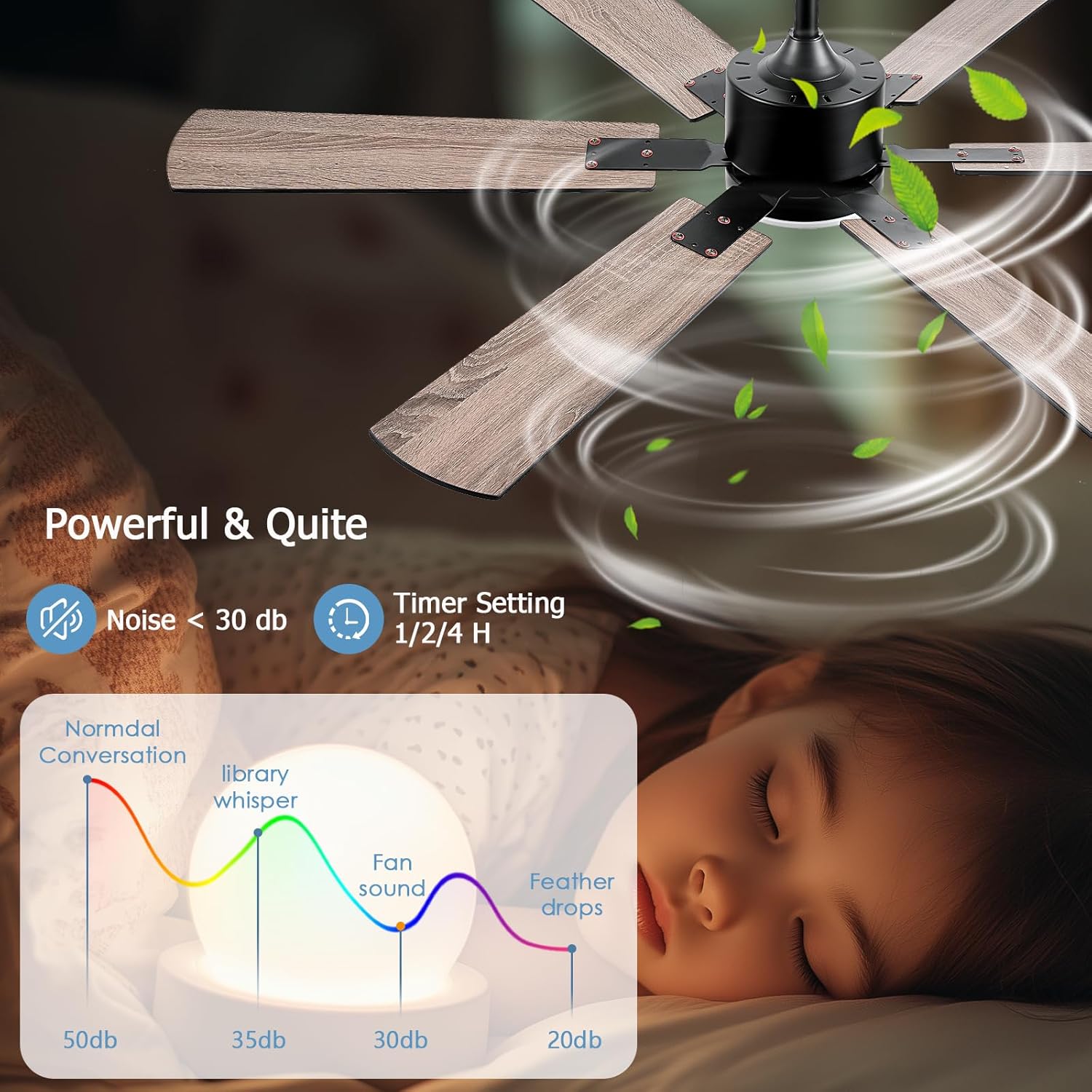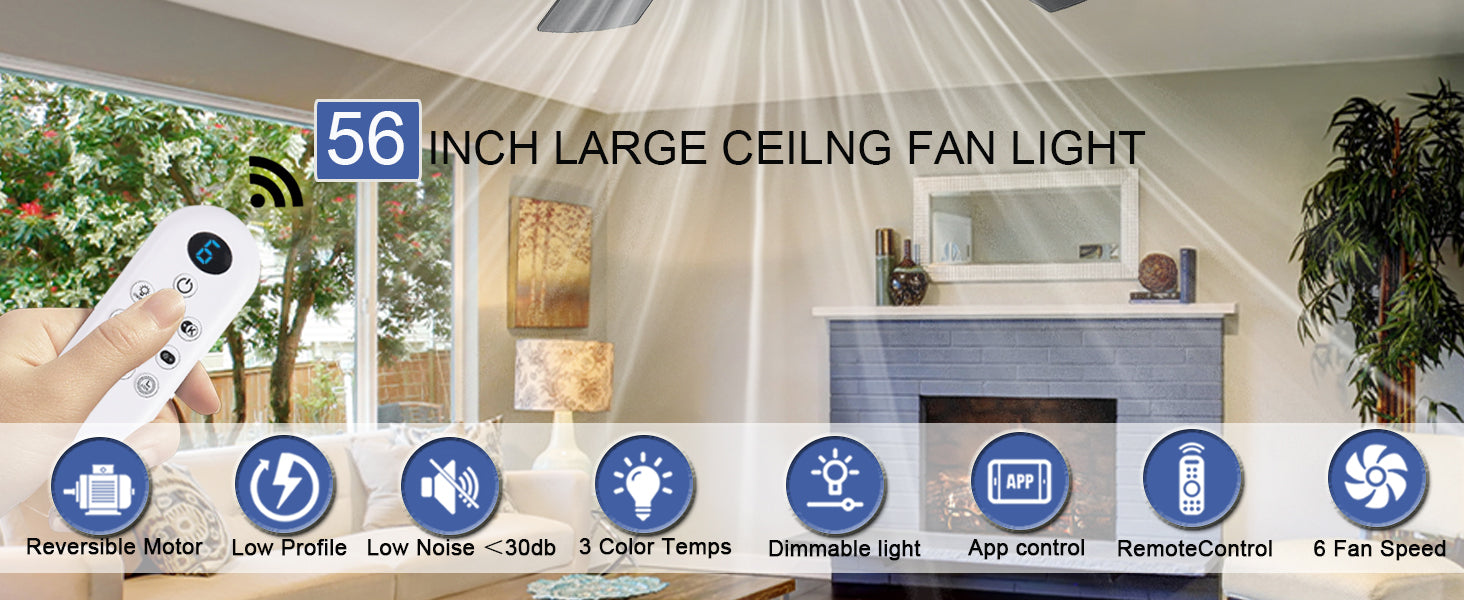 56inch Ceiling Fans with Lights and Remote/App Control, Dimmable LED, Reversible DC Motor, Noiseless, 6 Double-Side blades, 6 Speeds Low Profile Ceiling Fan for Indoor/Outdoor Use