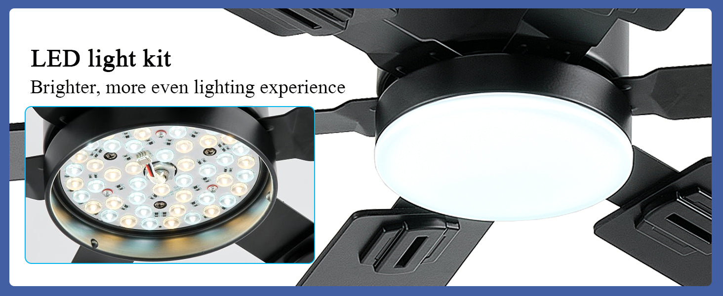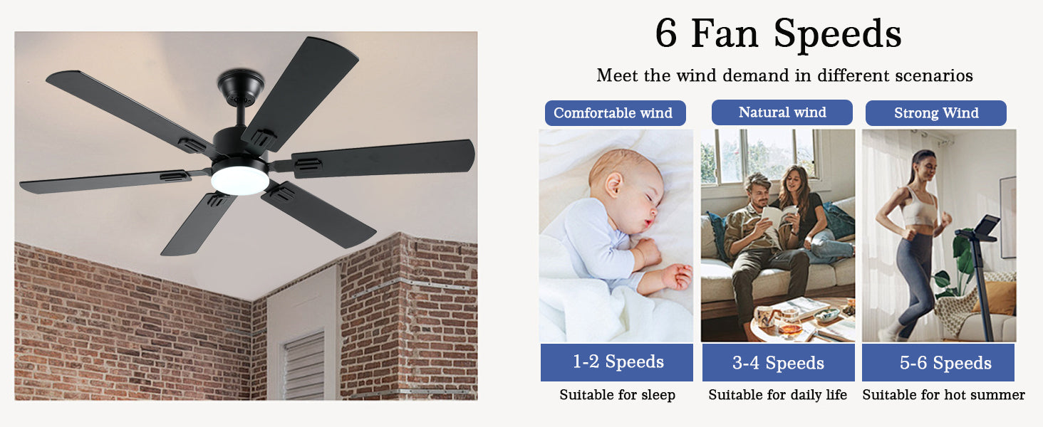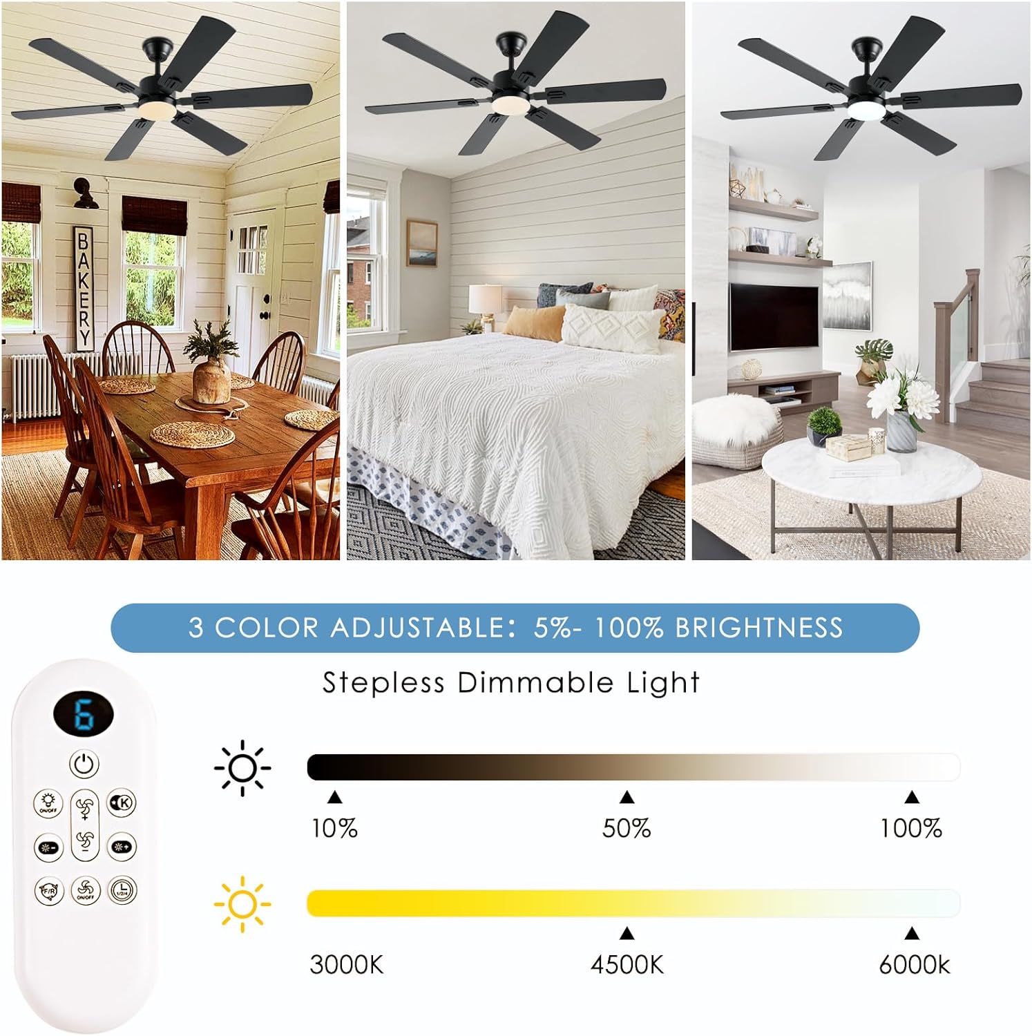 • 【3-color dimmable LED light】Our black ceiling fan comes with an 3-color dimmable led light, which is more energy-saving and convenient. Press the "LIGHT ON/OFF" button to turn on the light {from warm white (3000K) to natural light (4500K) to cold white (6000K)}. In addition, the fan and the light can work simultaneously or independently. The brightness can be adjusted from 5% to 100% to meet different lighting needs in different environments.