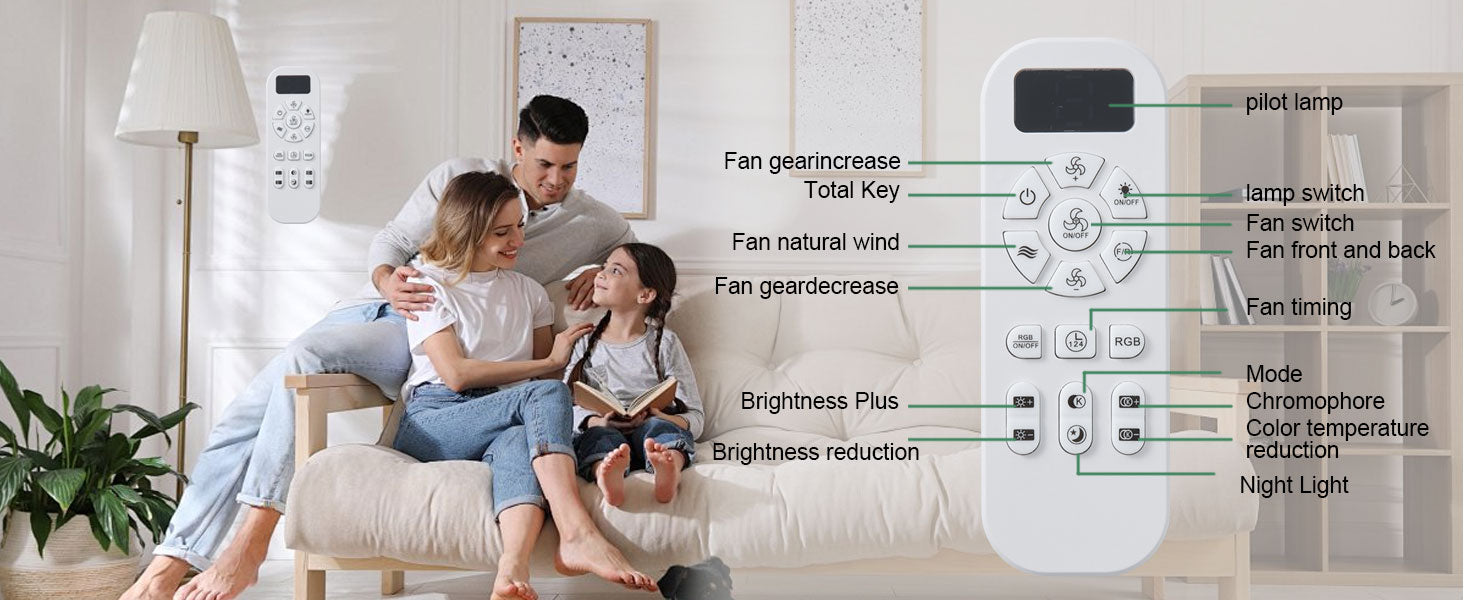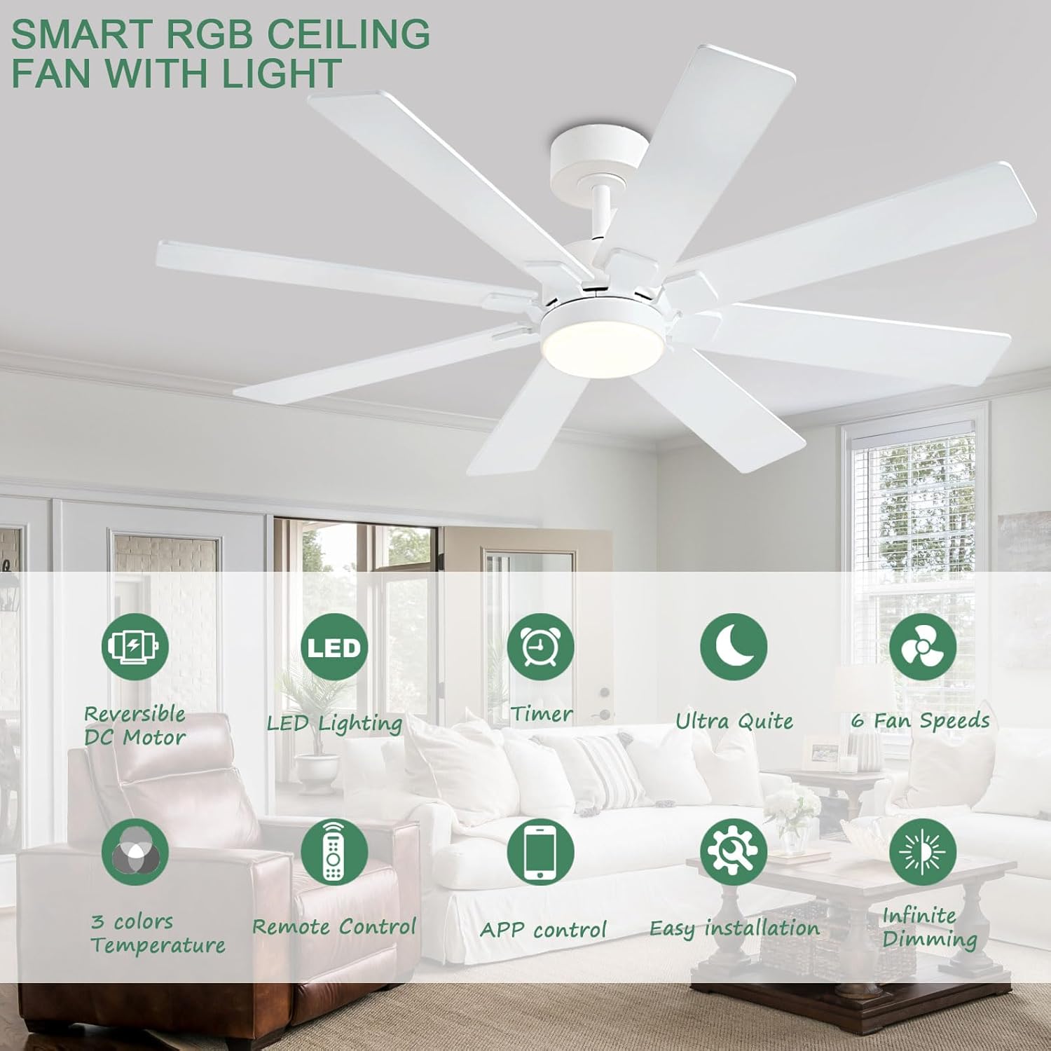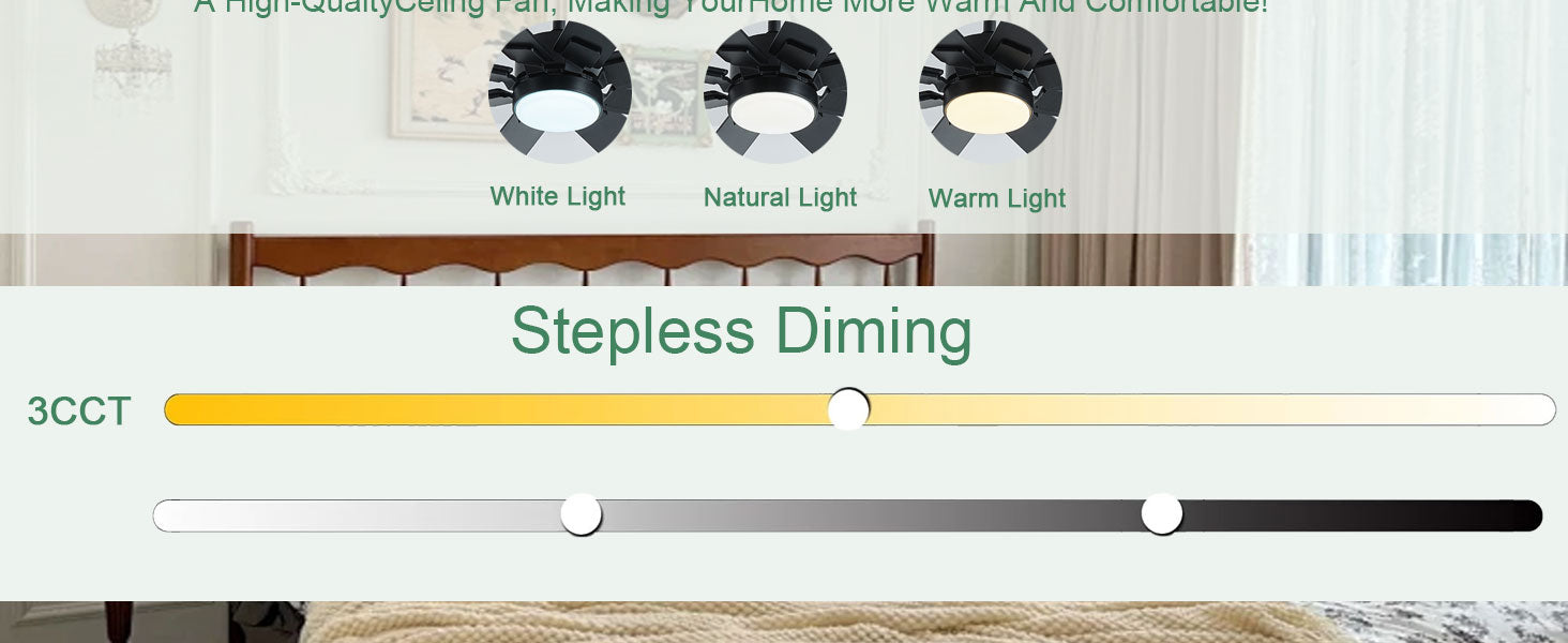 Yes, all our ceiling fans feature dimmable LED lights with adjustable brightness. You can choose from warm white (2700K), neutral (4000K), or cool white (6000K) lighting to match your room's ambiance. Brightness and color temperature can be controlled via the included remote or wall control.