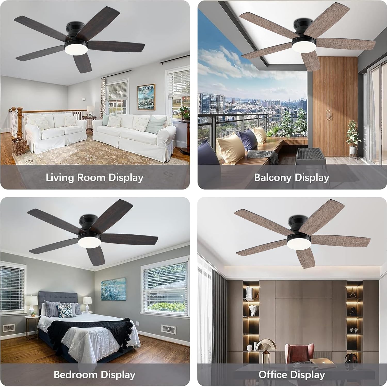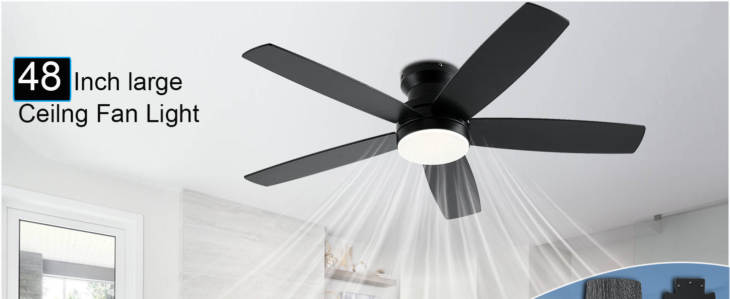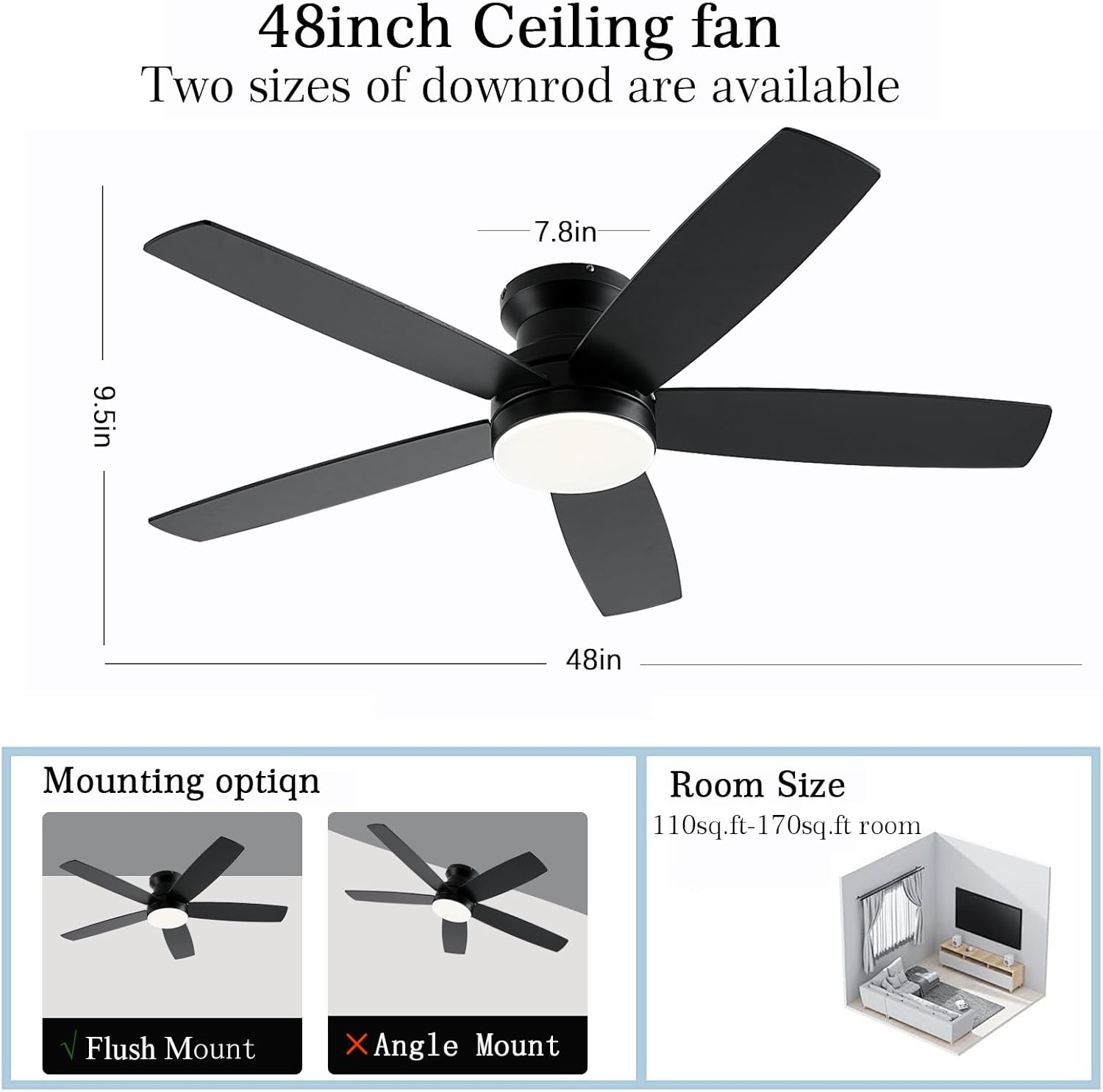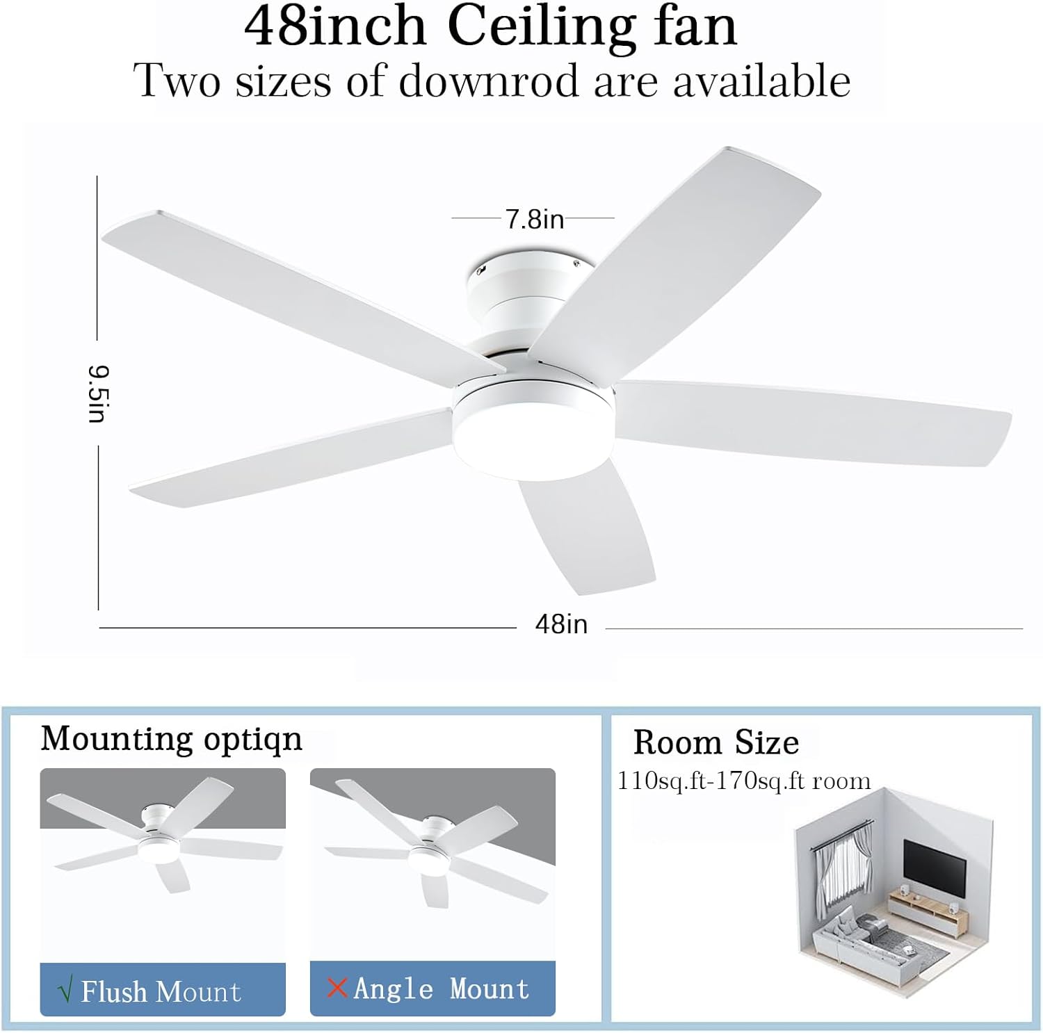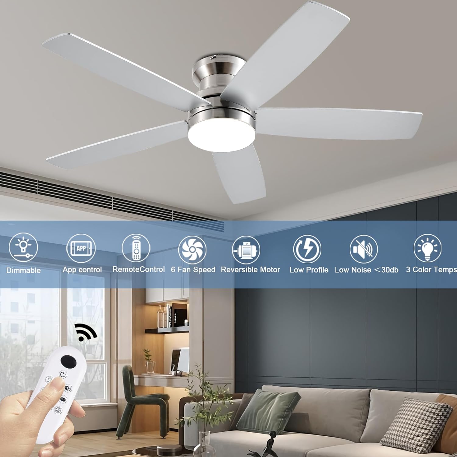 48Inch Flush Mount Ceiling Fans with Lights and Remote/App Control, Reversible DC Motor, Dimmable LED, Dual-Sided Blades, Low Profile Modern Ceiling Fan for Indoor Outdoor Use