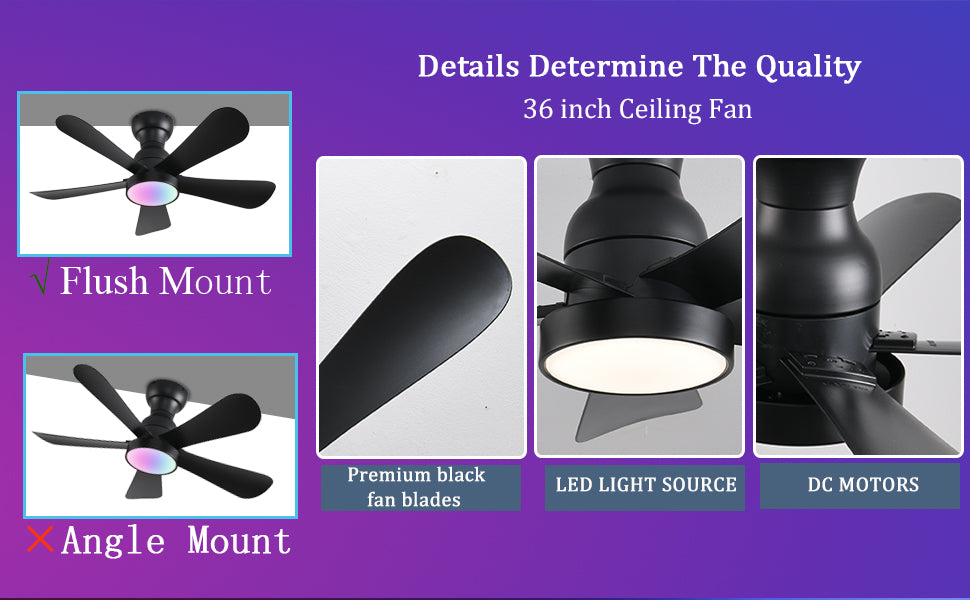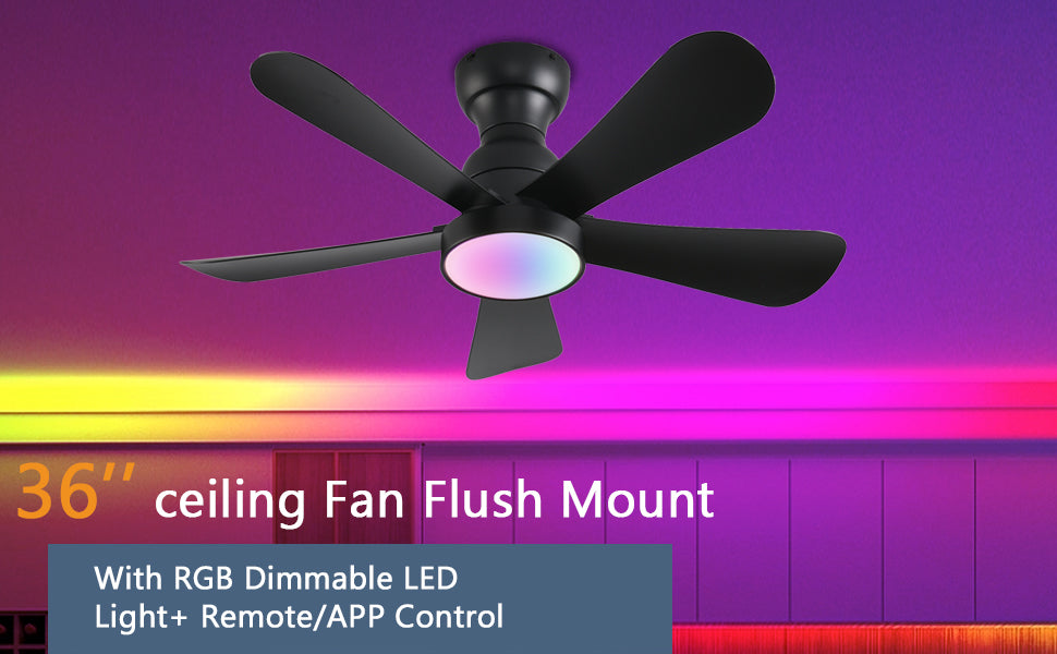 36inch Ceiling Fans with Lights and Remote/App Control, Flush Mount Ceiling Fan with Reversible Dc Motor RGB Dimmable Light, Noiseless Black Modern Small Ceiling Fan for Bedroom Indoor/Outdoor