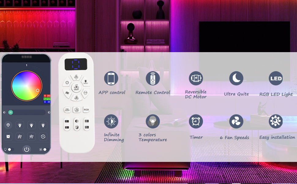 • 【Ceiling fan with remote control/app】All operations of our ceiling fans can be controlled by remote control and app. You can scan the QR code in the user manual, download and pair the app, and control the fan light through your mobile phone. The ceiling fan can adjust 6 speeds and 3 colors of light, and can be timed to turn off. The fan and the light can be turned on separately.