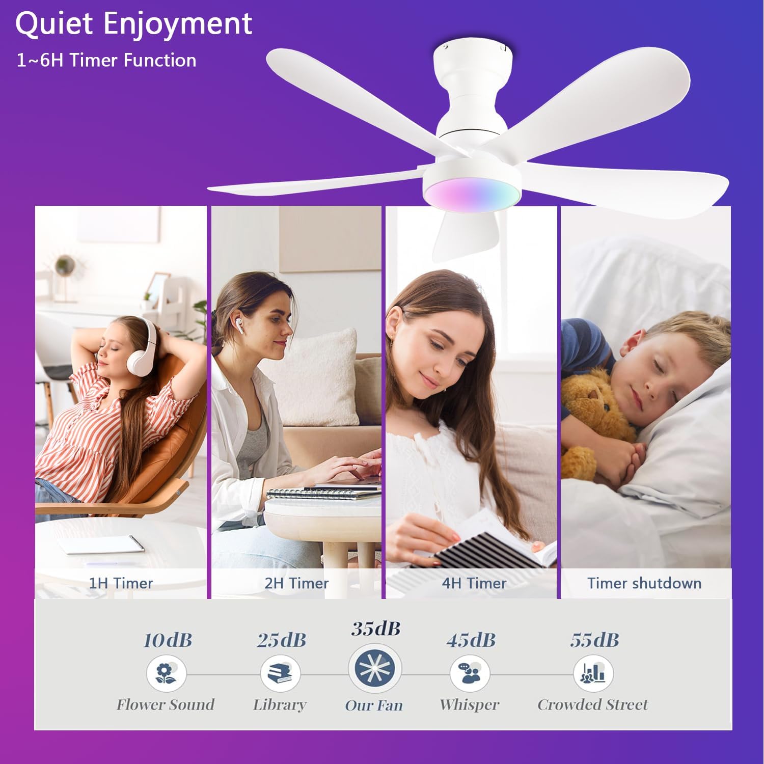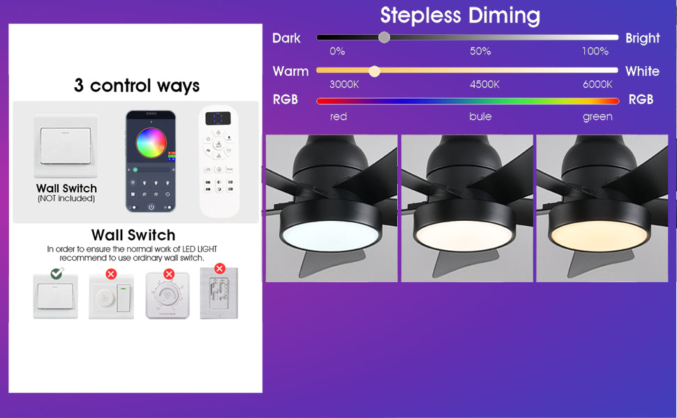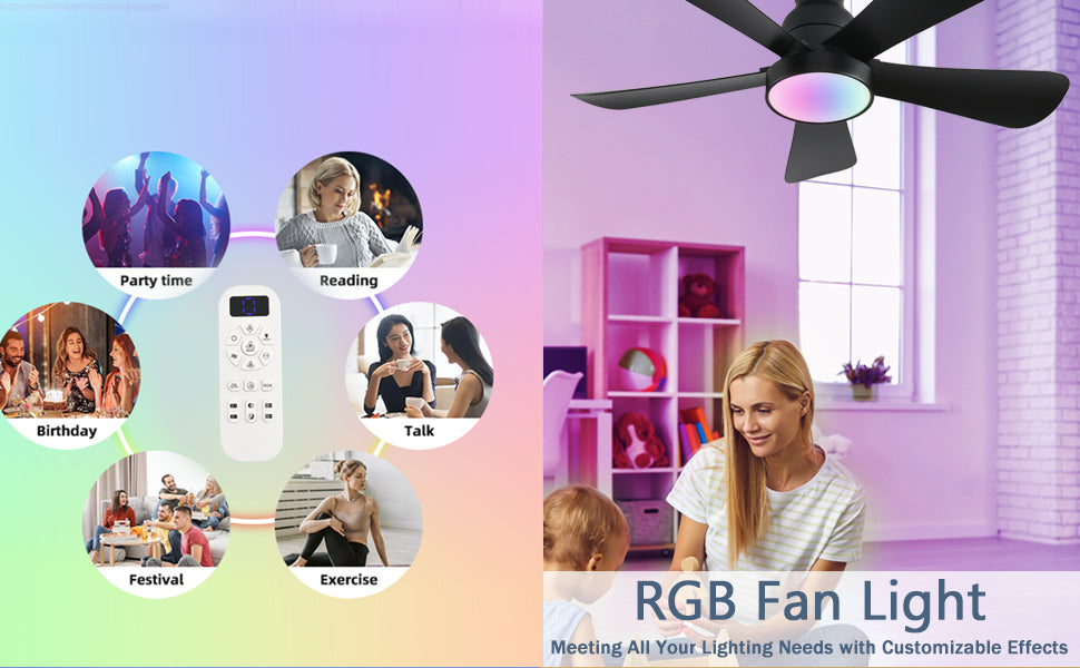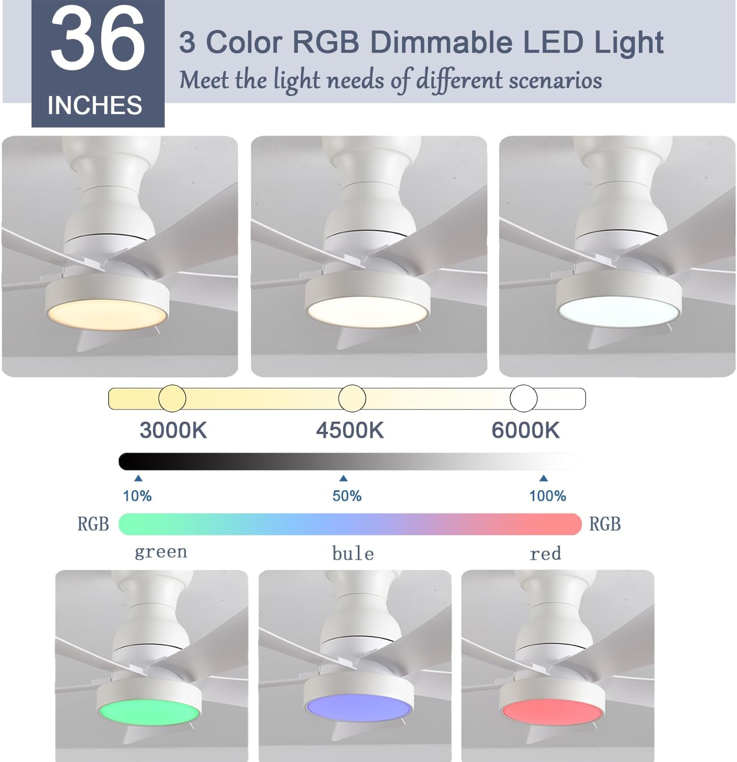 • 【Dimmable rgb led ceiling Fan】Press the "on/off light" button to turn on the light {from warm white (3000K) to natural light (4500K) to cool white (6000K)}. The brightness of the low profile ceiling fan can be adjusted within the range of 5% to 100% to meet different lighting needs in different environments.