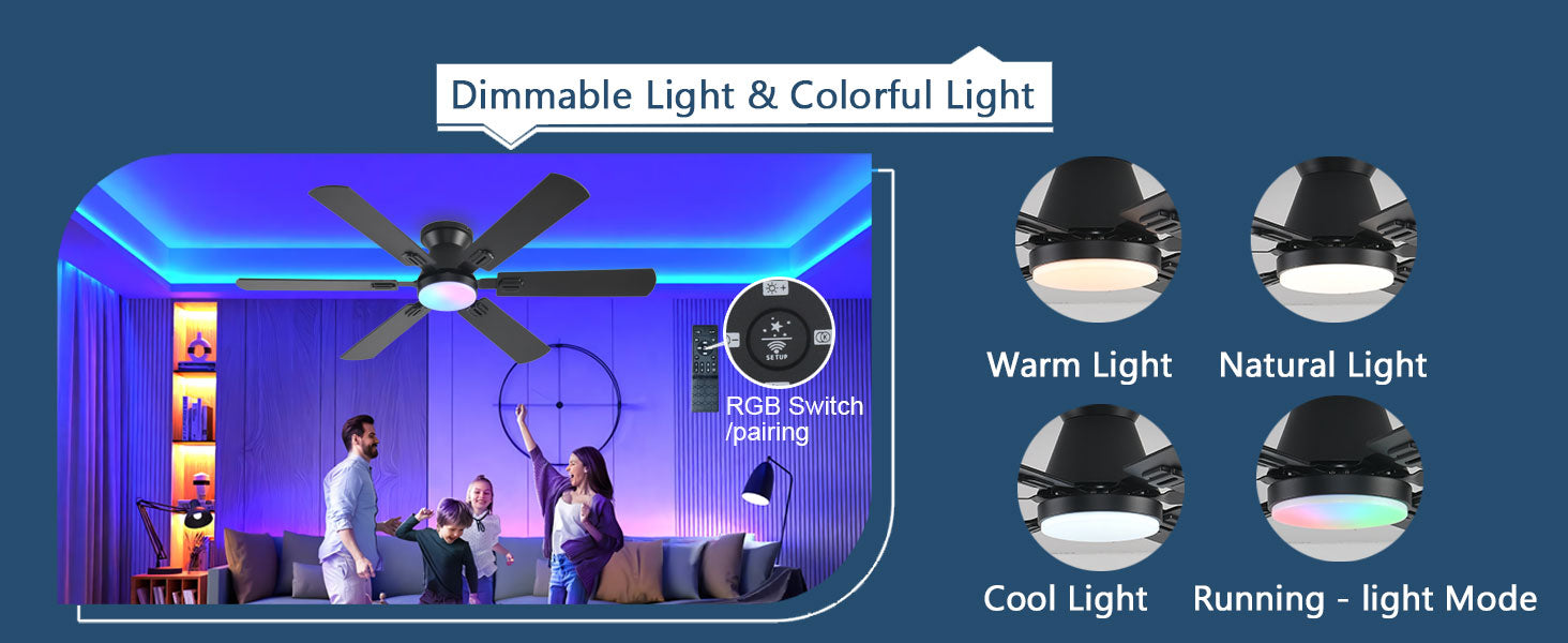 Yes, all our ceiling fans feature dimmable LED lights with adjustable brightness. You can choose from warm white (2700K), neutral (4000K), or cool white (6000K) lighting to match your room's ambiance. Brightness and color temperature can be controlled via the included remote or wall control.