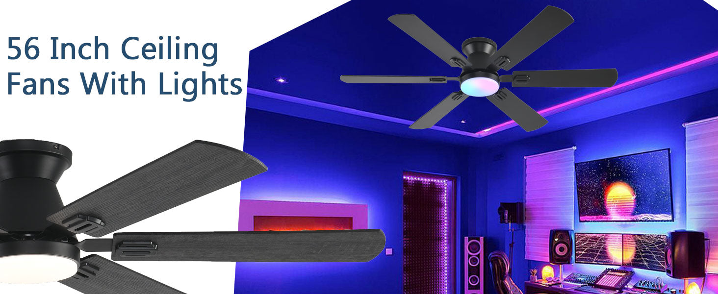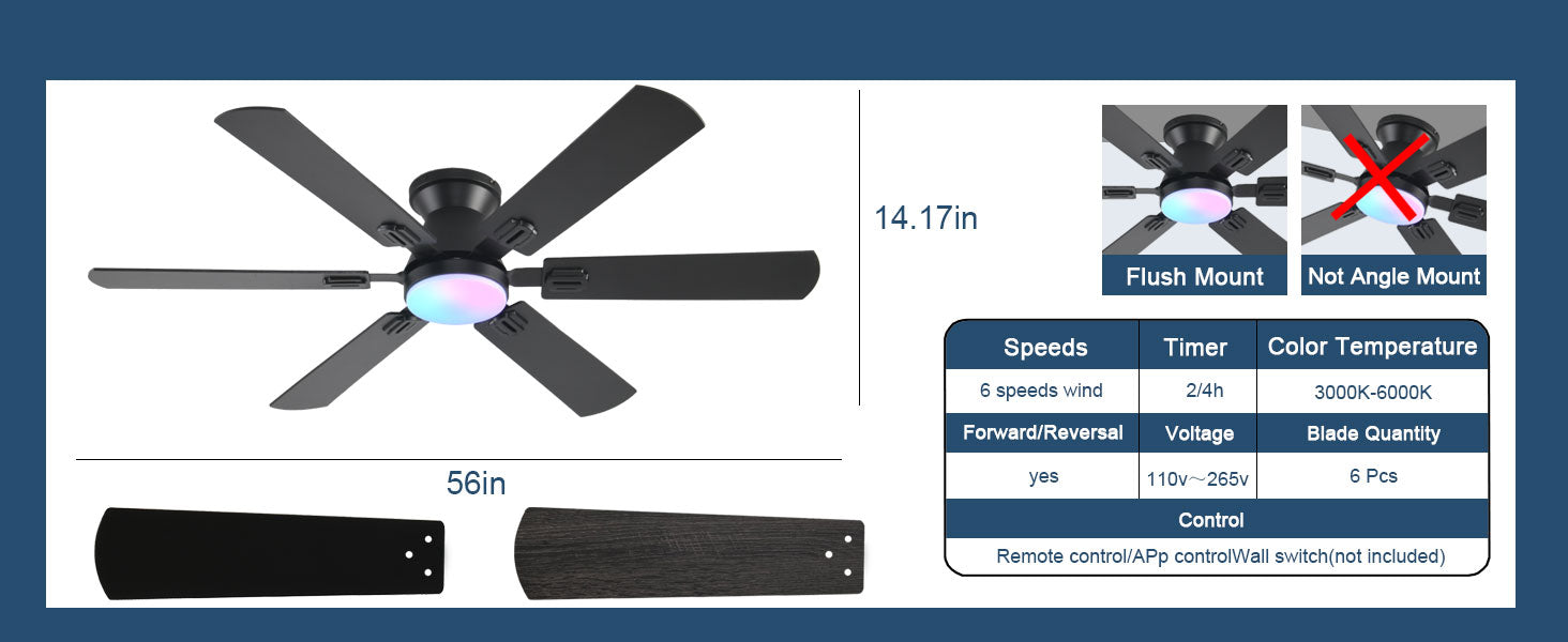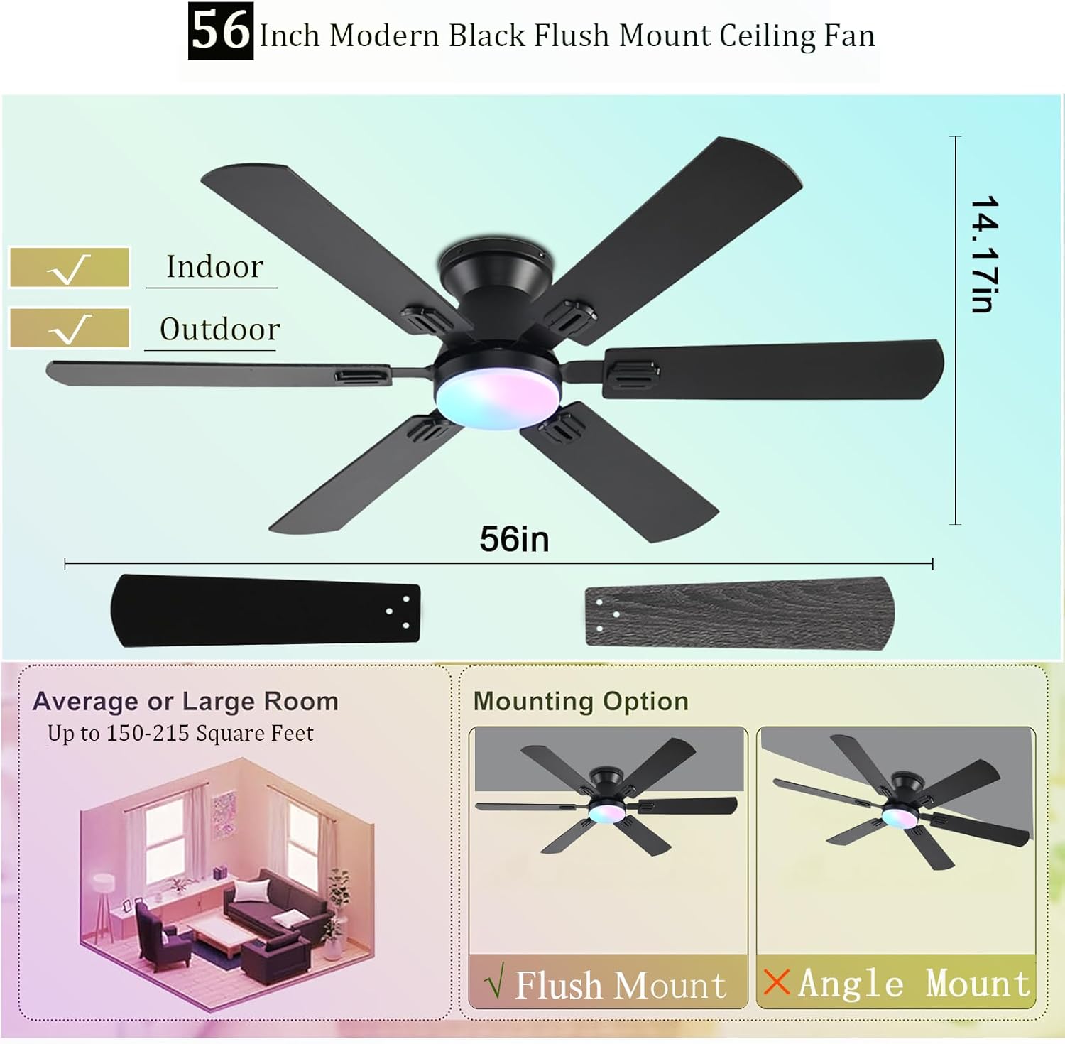 56 "RGB Ceiling Fans with Lights - App & Remote Control, Quiet Reversible DC Motor, Flush Mount Double-sided Blades, 3CCT Dimmable, Smart Low Profile Ceiling Fan for Bedroom Kids Room