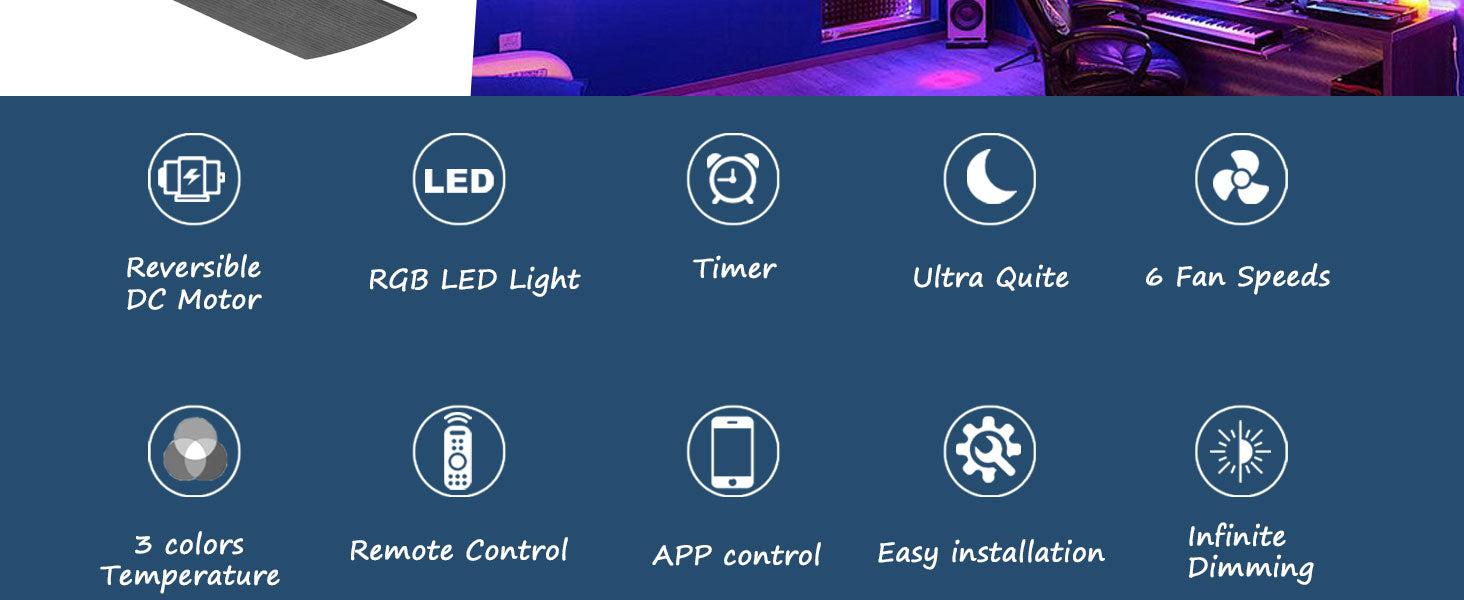 The thing I liked most about this fan was how simple it was to put together as well as install. The noise level is on the quieter side and it has a really good air flow. I like that the blades are reversible should you choose to go with white or the wood finish according to your own look preference.It comes with a remote controller for the fan and it has 6 different speeds, 3 different hues for the bright light and I could get the RGB light to work for myself but it has that as well.It’s decent and I like how it looks in the room I put it in.