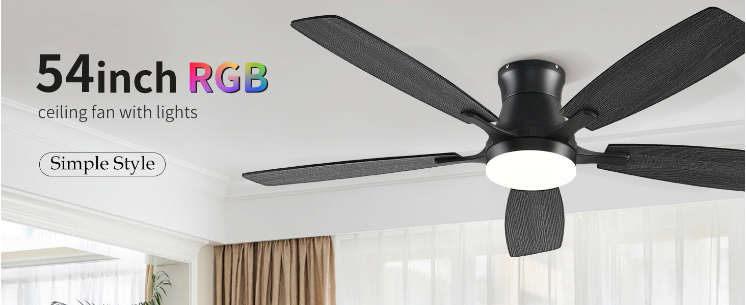 54inch Ceiling fans with Lights, Low Profile RGB Ceiling fan with Light and Remote/App Control, Dimmable, DC Reversible Motor, Noiseless, 6 Speeds, Black Ceiling Fan For Bedroom Indoor Outdoor