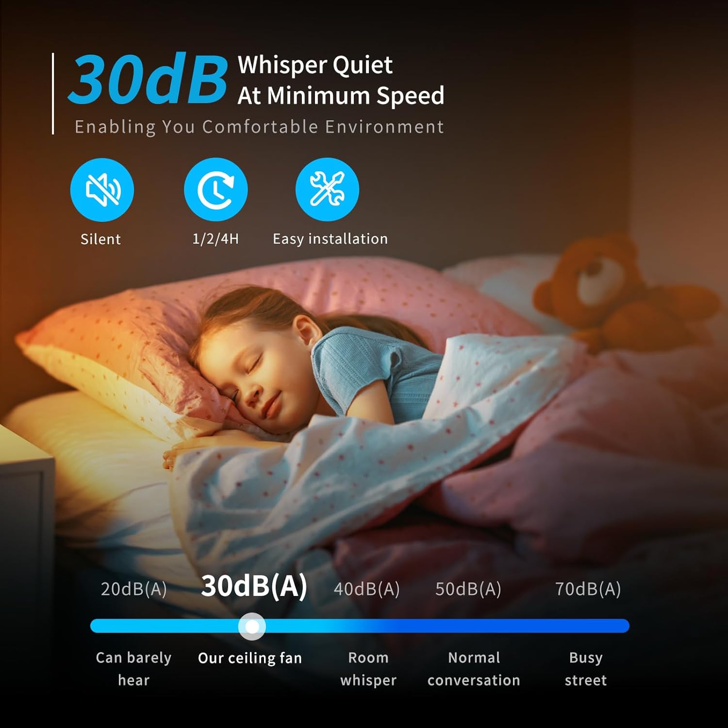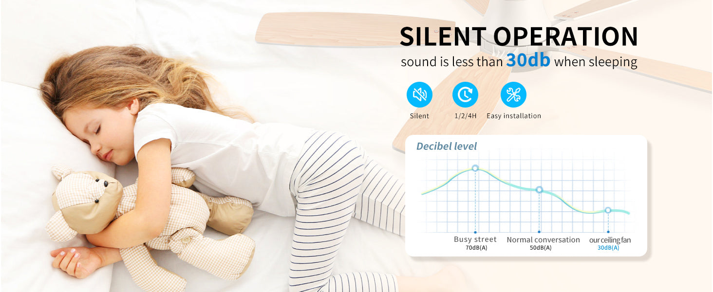 Our fans operate exceptionally quietly thanks to advanced DC motor technology. At the highest setting, they produce less than 35 dB - quieter than a whisper. On lower settings, they're virtually silent, making them ideal for bedrooms, nurseries, and quiet living spaces.
