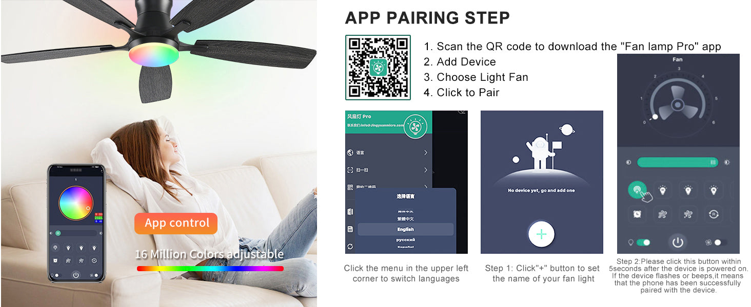 Imagine from the bed or couch controlling your ceiling fan….this is what happens with this fan. There is an app that you download it supports Apple and Samsung! The light goes from bright light to dim to green to red, fan has 6 speeds. Sooo quiet, perfect size and is so cute!