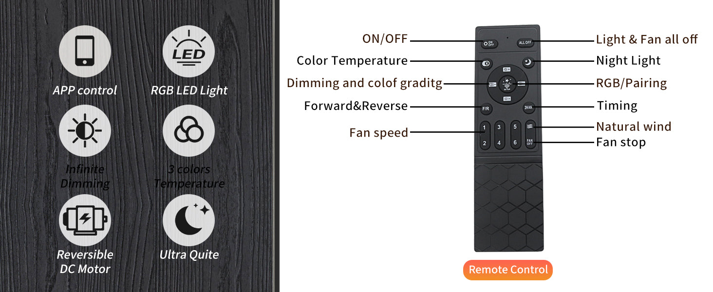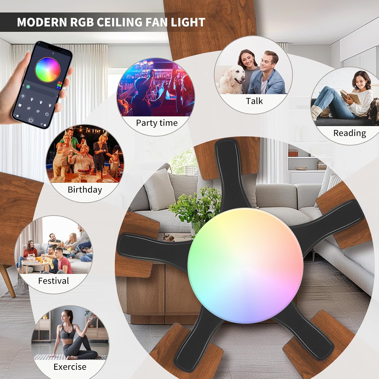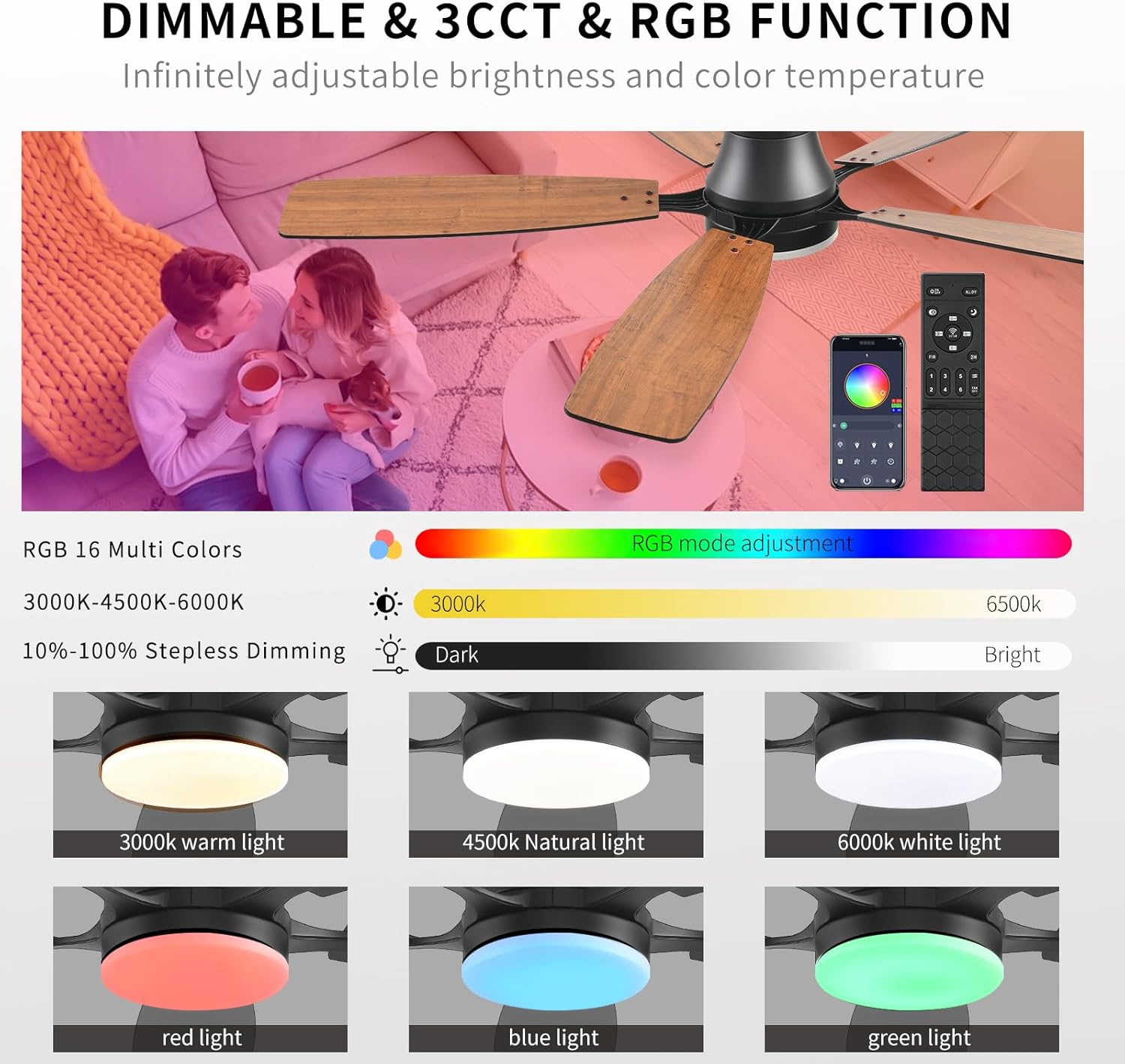 • 【 Dimmable Led & RGB Ceiling Fan】:The ceiling fans with lights features tri-color LED lights and RGB ambient lighting,Lighting can be controlled via the remote control and the App to switch from warm white (3000K) to natural light (4500K) and then to cool white (6000K),the ceiling fan can be adjusted between 10% and 100%. Double - press the "pair" button to switch between various RGB lighting modes. Enjoy the classic red - green - blue lighting modes and the eye - catching running - light mode, creating a vibrant and dynamic ambiance.