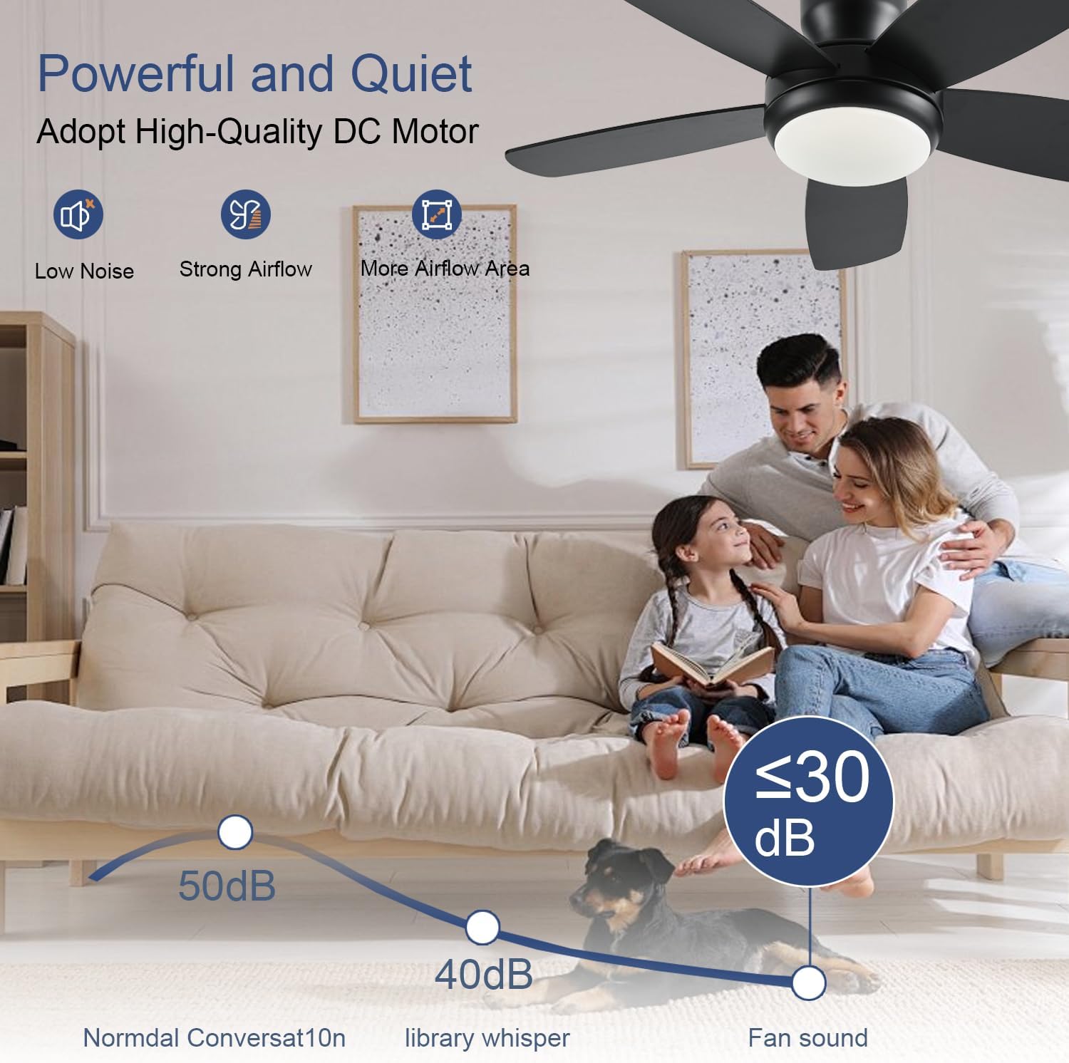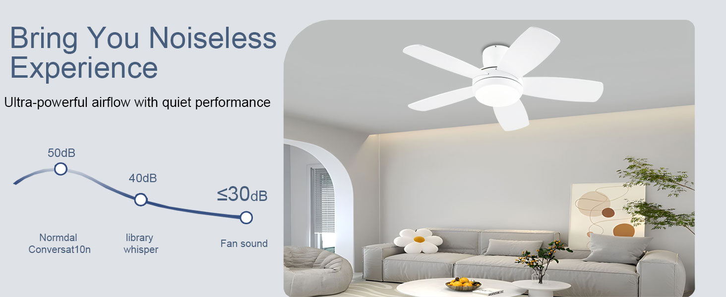 Our fans operate exceptionally quietly thanks to advanced DC motor technology. At the highest setting, they produce less than 35 dB - quieter than a whisper. On lower settings, they're virtually silent, making them ideal for bedrooms, nurseries, and quiet living spaces.