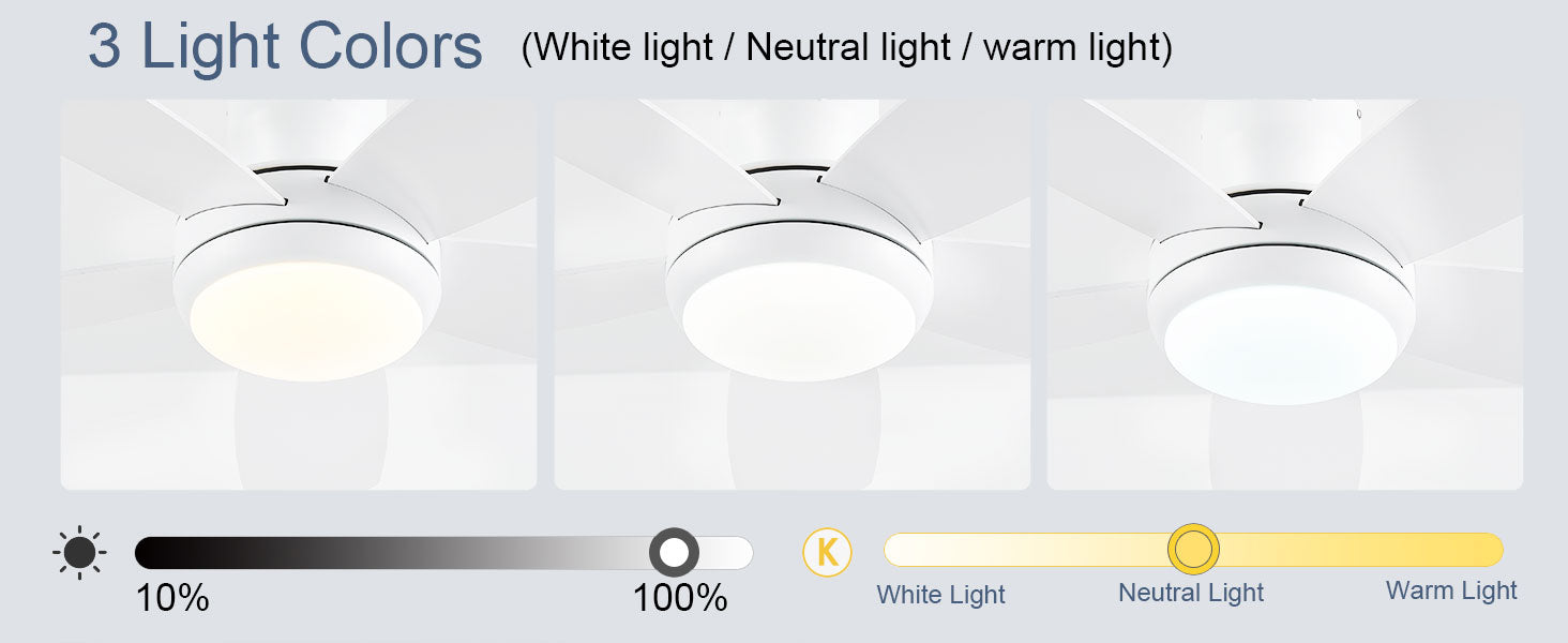 • 【Dimmable LED Light Ceiling Fan】: Our 52-inch ceiling fan features adjustable lighting design with a 18W LED light panel. It offers brightness adjustment from 10% to 100% and comes with 3 light colors (3000K warm light, 4500K natural light, 6500K cool light) to meet various indoor settings such as study rooms, bedrooms, and night time lighting needs.