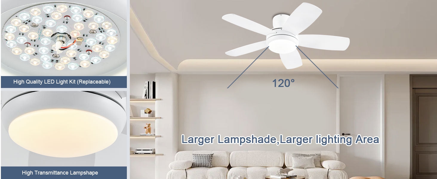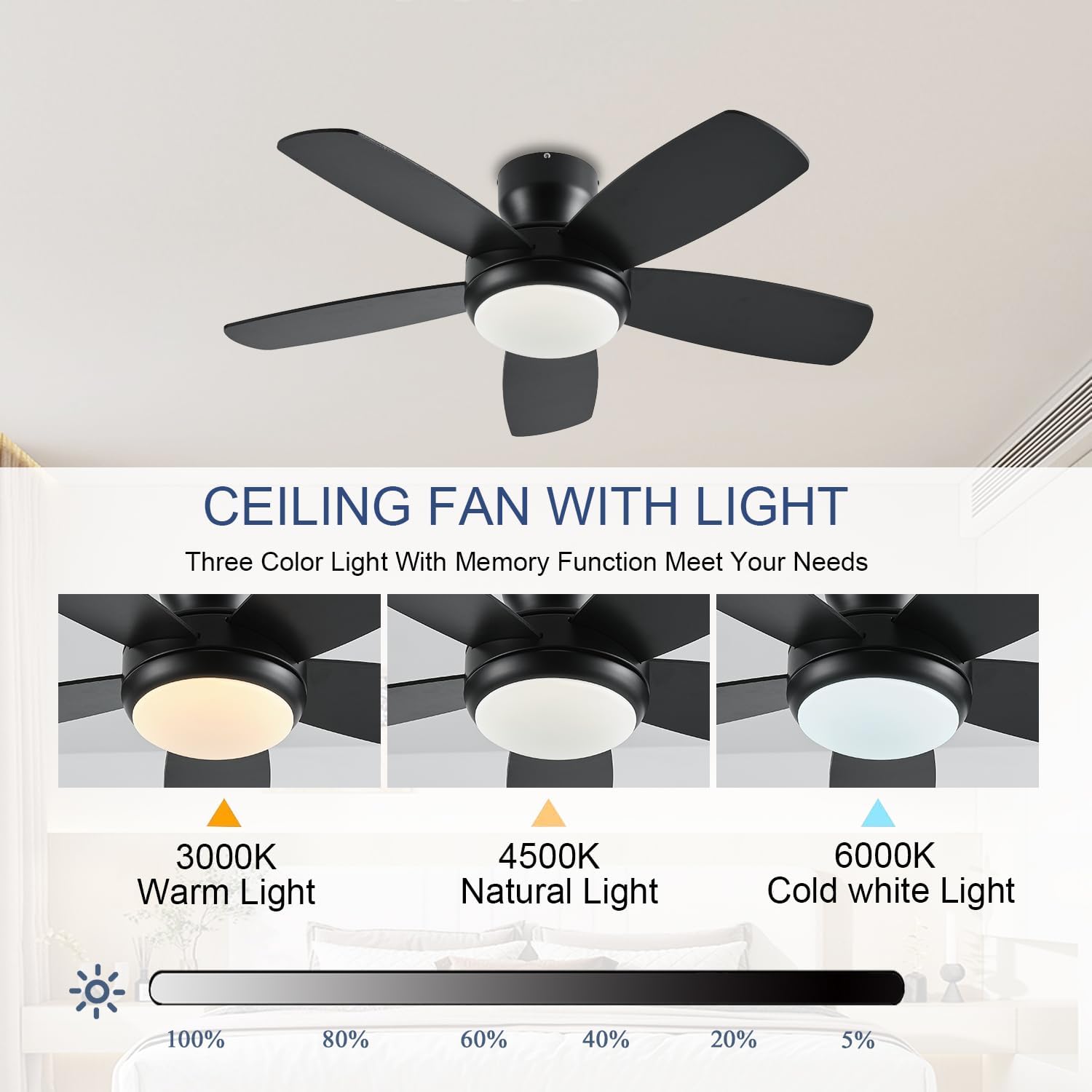 Yes, all our ceiling fans feature dimmable LED lights with adjustable brightness. You can choose from warm white (2700K), neutral (4000K), or cool white (6000K) lighting to match your room's ambiance. Brightness and color temperature can be controlled via the included remote or wall control.