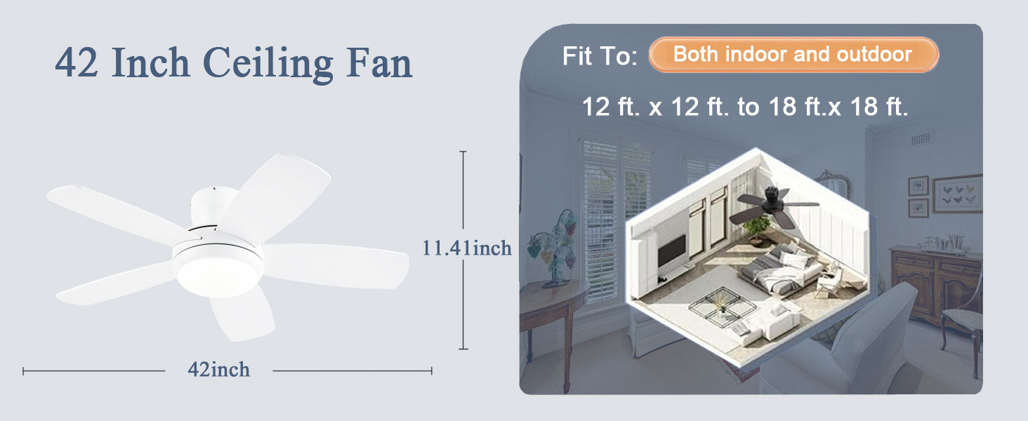 42 Inch Ceiling Fan with Light and Remote/App Control, Low Profile Ceiling Fans with Lights,Flush Mount, Double-Sided Blades, 3CCT, Dimmable, Noiseless, White Ceiling Fan for Indoor/Outdoor Use